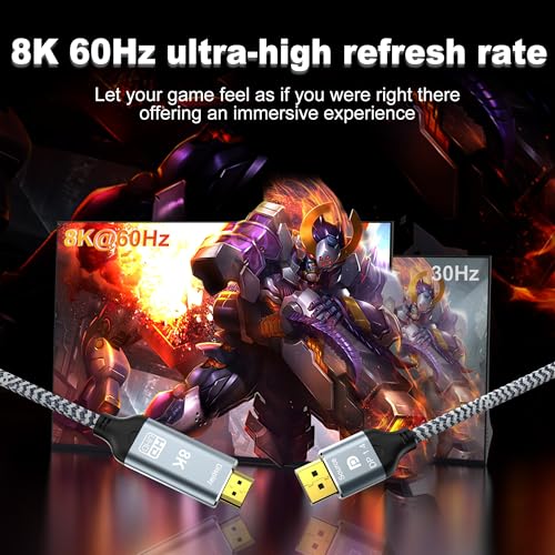 【Upgrade Revolution 】 this Displayport 1.4 to HDMI 2.1 8K Cable achieves a quantum leap in transfer speed,Backward compatible with DisplayPort 1.2, 1.2a, 1.1, and 1.0 standards. increasing from 21.6Gbps to 32.4Gbps (HBR3). delivering vivid colors and a 4K 120Hz refresh rate.This eliminates lag and frame drops during video playback, FPS gaming, and AAA titles.( *Note: Not support for eARC)