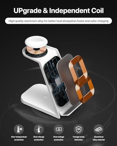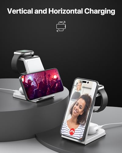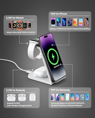 [Universal Compatibility]:This 3 in 1 wireless charging station is widely compatible with iPhone 17/16/15/14/13/12/11/X/8 series.Also compatible with iWatch Ultra/10/9/8/7/6/5/4/3/2/SE,AirPods 2(with wireless charging case)/3/Pro.(Note: Wireless charger not compatible with Samsung Watch)