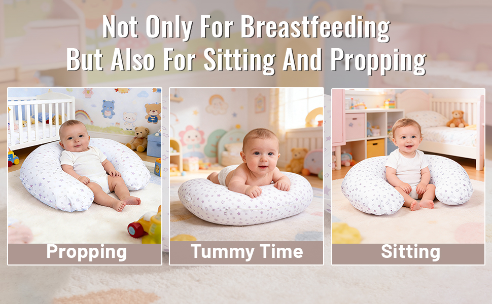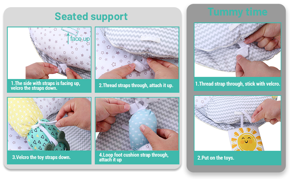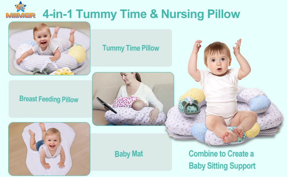 - Multifunctional Support Cushion: 4- in-1 Tummy Time & Nursing Pillow is a practical design for baby and mom to use for tummy, breast feeding, sitting support, floor play— helping your baby hit all their key milestones from birth to 24 months. This tummy time pillow playmat to help baby exercise the prone abilities and providing stable support when baby is learning to sit up.