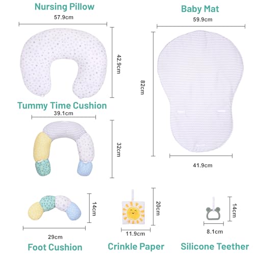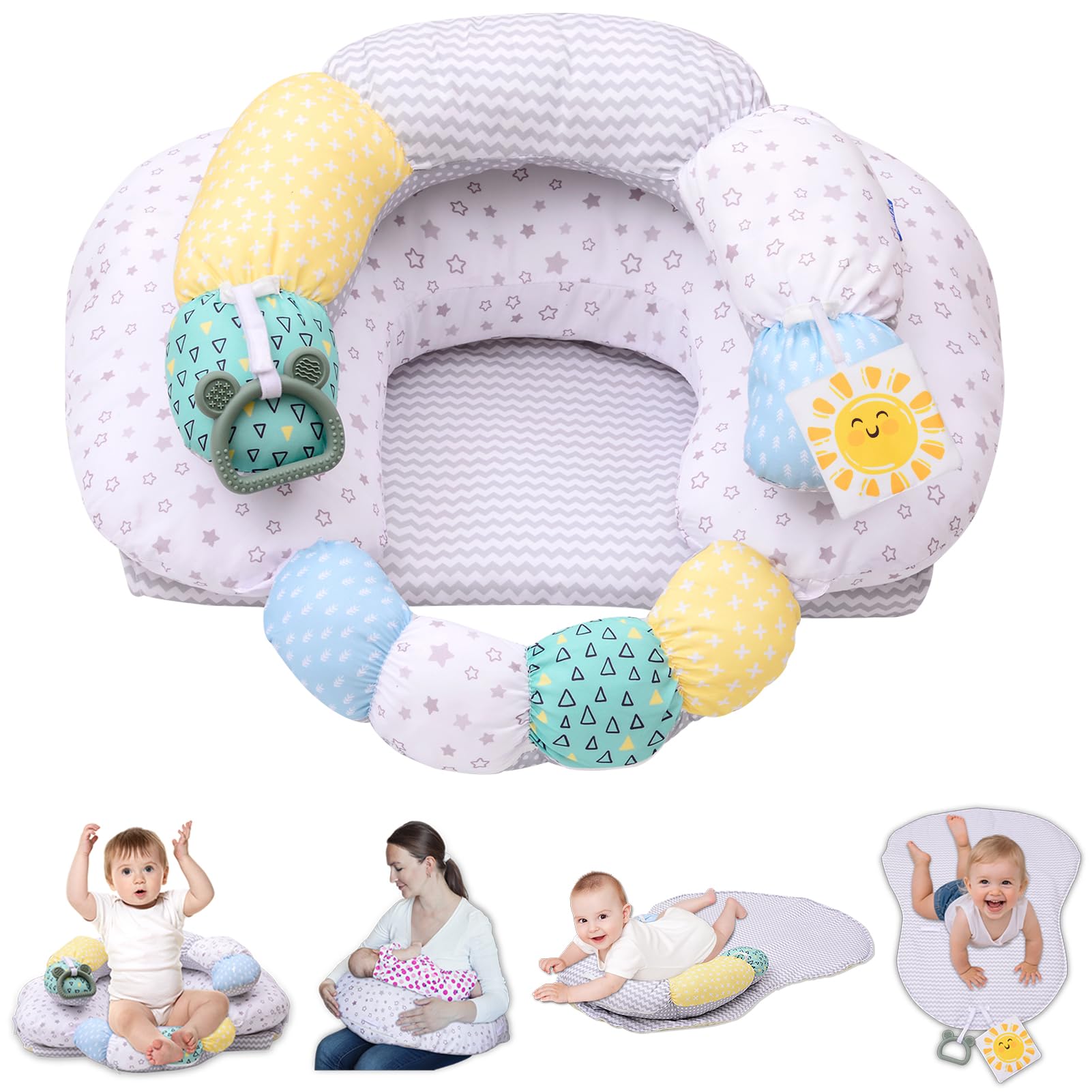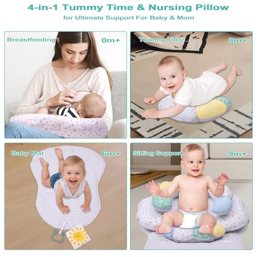 4-in-1 Tummy Time & Nursing Pillow with High, Firm, Large Area, Detachable Seated Support Cushion, Removable and Machine Washable Slipcovers, Baby Play Mat and Toys 0-24 Months