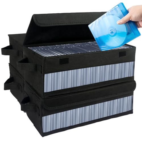 4 Pack CD Storage Boxes with Cover, 14.4″x6.3″x5.5″ CD Storage Case, Side Visual CD Case, CD Box Holds 30 CDs in Full Jewel Cases, 60 CDs in Slim Cases, and 170 Discs in CD Sleeves, Black