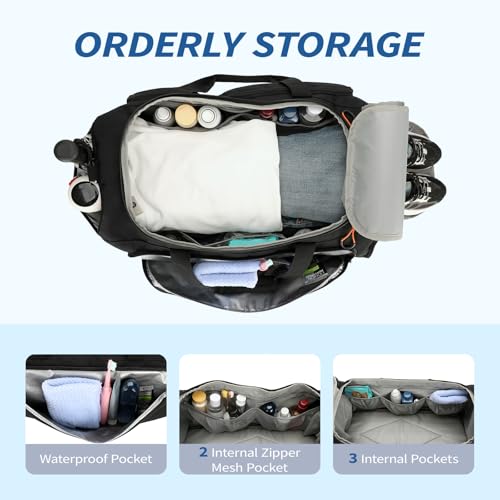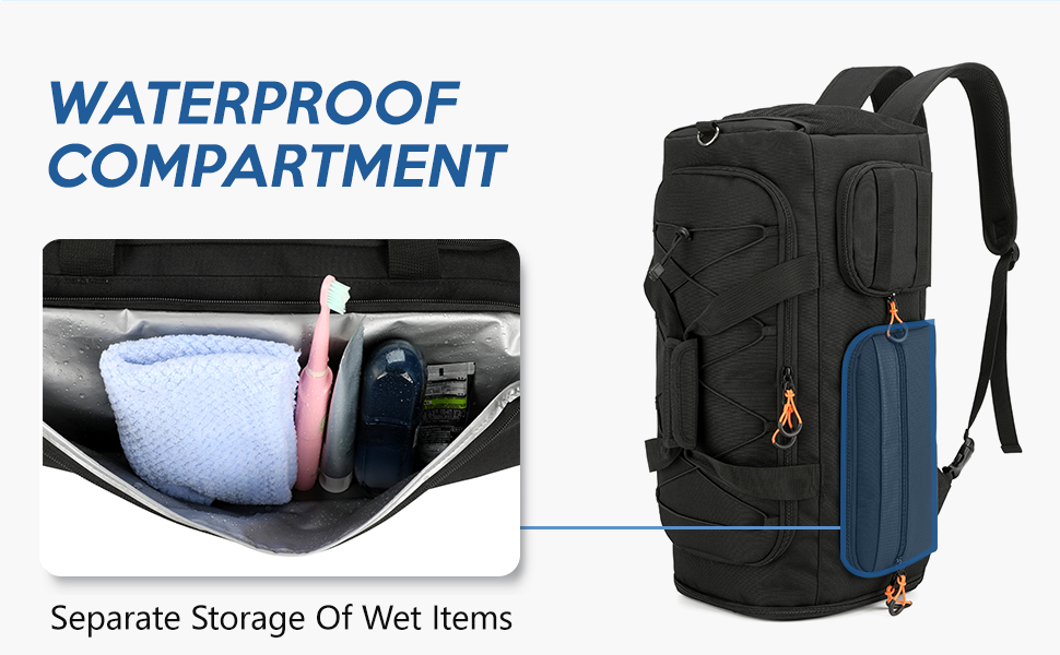 - [ Shoe Compartment & Wet Pocket ] : This travel bag includes a dedicated shoe storage area to keep dirty shoes separate from other gear, along with ventilation holes to prevent odor buildup. On the other side, a high-density waterproof PVE wet pocket is perfect for storing damp clothes and towels after workouts or travel, ensuring items stay dry.