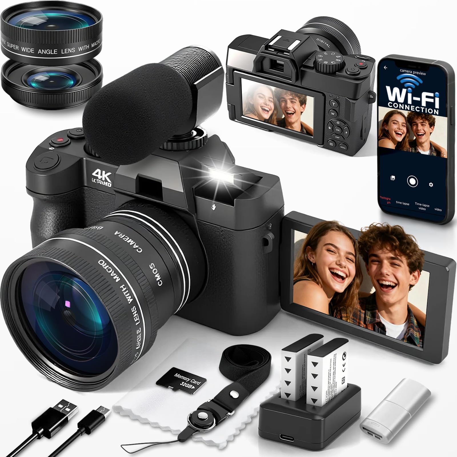 4K Digital Camera for Photography with WiFi Vlogging Camera for YouTube Auto-Focus Compact Digital Camera with Flip Screen, with 2 Batteries, Wide & Macro Lens, Microphone, MicroSD Card, Card Reade