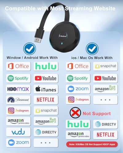 - 【Universal Compatibility】This HDMI Wi Fi display adapter seamlessly supports a wide range of operating systems, including Android, iOS, Windows, and Mac. It supports DLNA, AirMirror, AirPlay, and Miracast modes, ensuring a versatile and convenient streaming experience. (Note: The wireless HDMI display adapter is not compatible with certain paid apps that violate video copyright protection, such as Netflix, Amazon Prime Videos, and Hulu.)