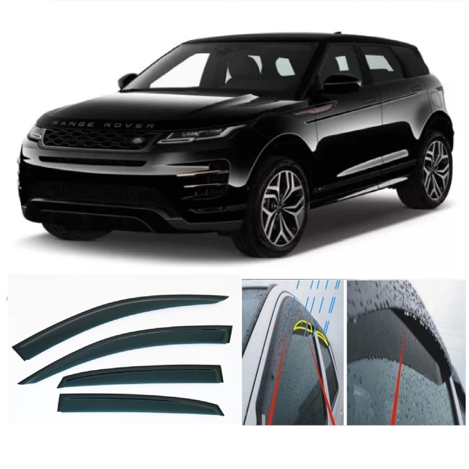Highest quality Rain Guards Wind Deflectors for Range Rover EVOQUE (L551) 2019 2020 2021 2022 2023 2024 2025 2026 * Second generation (L551; 2018) * Set includes: 4 pieces wind deflectors * Fits easily, simply installation guide included * Type: EXTERNAL Stick-on door frame * Colour: dark smoke tinted * Made of: cast acrylic glass with UV protection. Side windows wind deflectors protect the vehicle cabin from precipitation during rain or snowfall when the windows are not completely lowered. Provide natural air exchange in the car and prevent evaporation on the windows on rainy days, get rid of the driver and passengers from the air flow in them face, head and neck. Also the wind deflectors prevent the side windows from becoming soiled providing the driver better visibility including the rear view mirrors therefore serving to increase driving safety. It works as sun visor or sun guard too protecting from harmful ultraviolet light. In addition the wind deflector serves as a supplement to the appearance of the car and gives the vehicle an exclusive design. Our wind deflectors made of superior quality acrylic glass as a result of which the product has the following properties: – Ultra high impact strength – Resistance to chemically aggressive environments – High light transmission – Weatherproof – Durability – Relatively light weight – Flexural and tensile strength – UV protection – Heat resistance The technology of 3D laser scanning provides ideal geometry and also reliability of fastening at operation at high speeds. Simply and easy installation. OEM quality.
