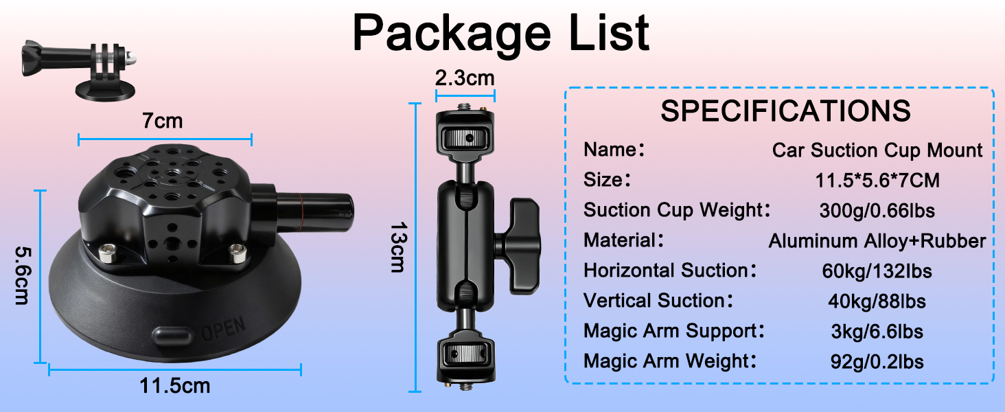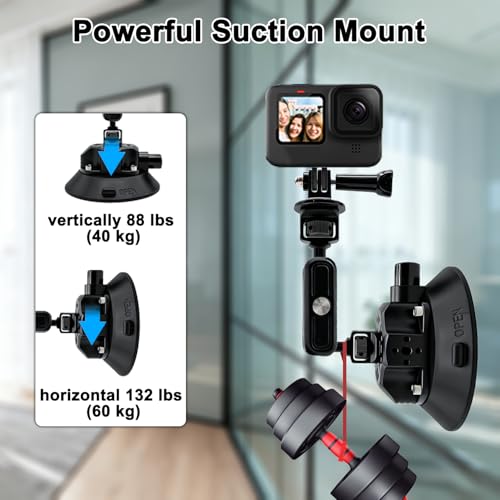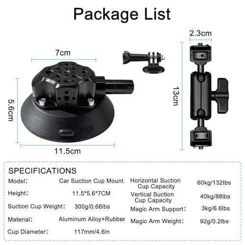 Powerful Load Capacity – Our suction cup mount holder features a robust metal structure. For stationary applications on horizontal surfaces, it can bear up to 132 lbs (60 kg); when positioned vertically, it supports up to 88 lbs (40 kg). And magic arm support 6.6 lbs (3kg). This mount ensures secure attachment for your DSLR or action camera even on rugged terrain while delivering crystal-clear footage free from shakes.