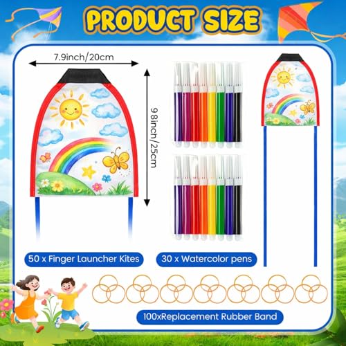 50 Pcs DIY Finger Launcher Kites for Making Kit, Easy to Fly Summer Decorating Coloring Mini Kites with Watercolor Pens and String Making Craft Kits for Outdoor Activities