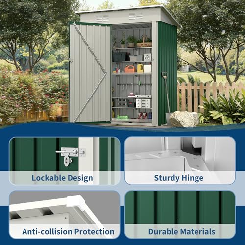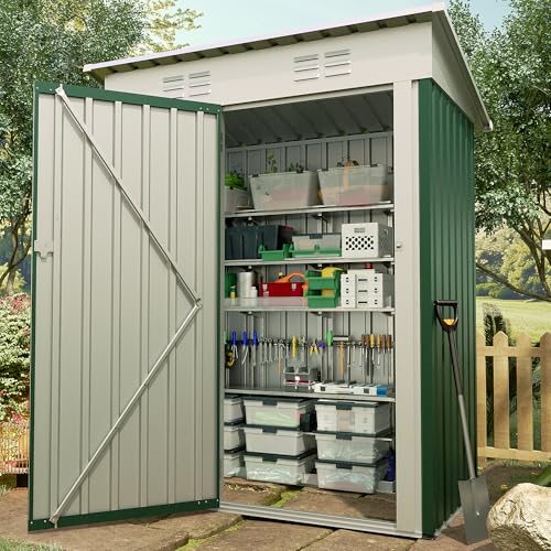 5×3 FT Outdoor Storage Shed, Heavy Duty Metal Lean-to Tool Shed with Lockable Door & Sloped Roof, Weatherproof Garden Storage Cabinet for Patio, Backyard, Lawn,152x90x183 CM, Gree