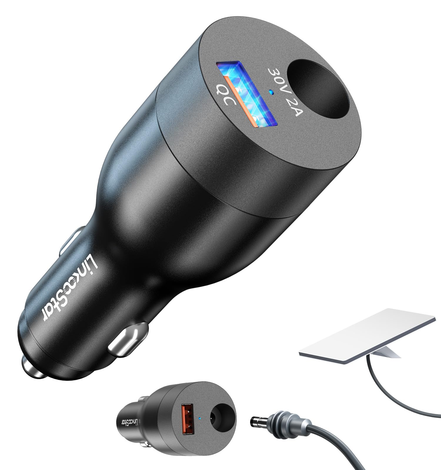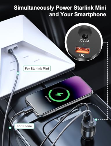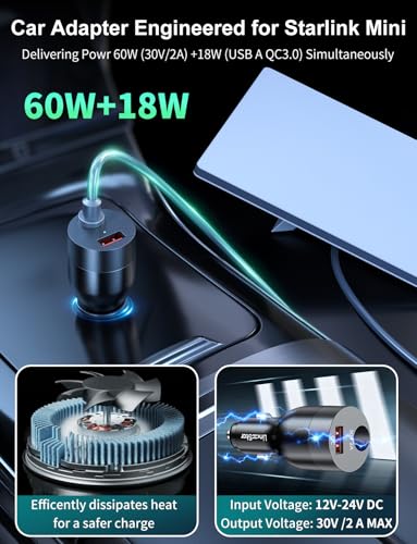 [ 78W High-Power Output 2 IN 1 ] Equipped with 2 intelligent charging chips, the Starlink Mini boost converter comes with a 60W DC port dedicated to powering Starlink Mini, plus an 18W QC USB-A port for simultaneous charging of phones, tablets, laptops and other devices. Ideal for use in cars, trucks, RVs and boats.