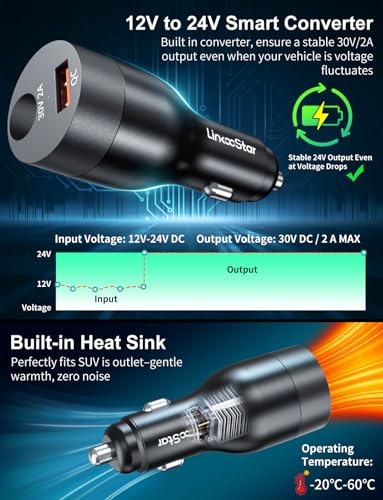 [ Stable Power + Hassle-Free Use for Starlink Mini ] The starlink mini dc adapter is compact plug-and-play 12V/24V cigarette lighter adapter delivers consistent power to Starlink Mini. Intelligent DC-DC tech converts 12V/24V cigarette lighter input to steady 30V/2A output. Its secure locking design avoids accidental disconnection, and voltage stabilization ensures zero dropout even in extreme conditions (-20°C to 60°C) , ideal for RV, SUV, Yacht.