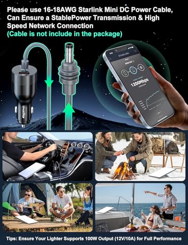 [Compatible with 30M/98.4FT 16 AWG Official Cables] The starlink mini 12v adapter works with the official 30-meter (98.4-foot) 16 AWG Starlink Mini cables, a good starlink mini accessories, enables distant dish placement to boost line of sight—zero power loss worries, plus stable and continuous signal. Tool-free Starlink Mini power supply: effortlessly converts 12V to 24V for your device. Note: Ensure your 12V cigarette lighter socket supports ≥144W (12V/12A) output before use.