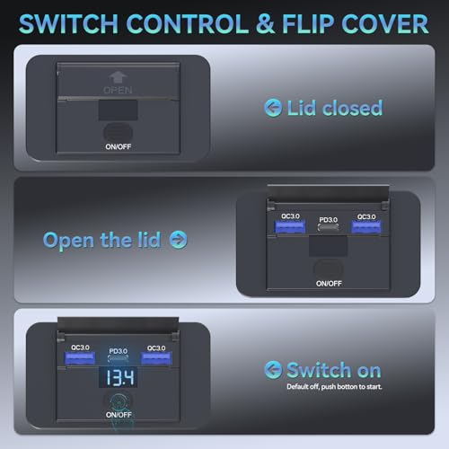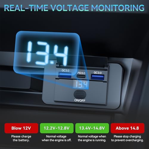 LED VOLTAGE DISPLAY & ON/OFF SWITCH: This Gibbab rv usb c outlet 12v wall mount features an easy-to-read voltage monitor that keeps you informed about your vehicle's battery health in real time—showing whether voltage is normal (12.2V–12.8V off / 13.4V–14.8V running), too low (<12V: “Please Charge Battery”), or too high (>14.8V: “Check Charging System”). A soft blue LED lights up the ports for easy nighttime use, and the on/off switch helps prevent battery drain. (Note: The switch is off by default. )