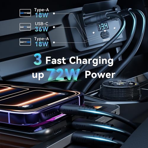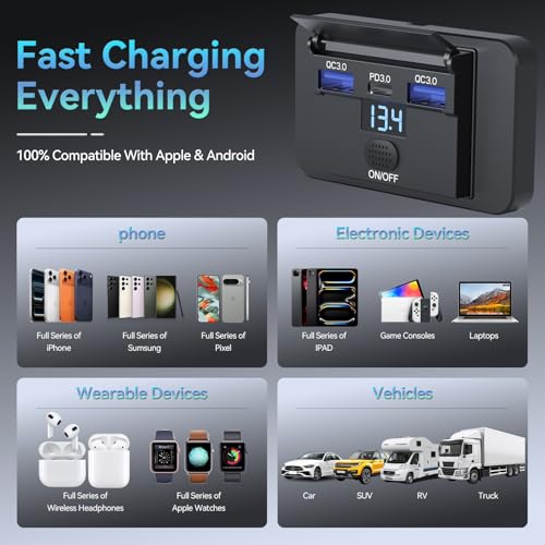 36W DUAL QC3.0 USB-A QUICK CHARGING: The 12 volt usb charging port each USB-A port delivers up to 18W, combining for a total 36W output. The usb 12v outlet quickly charges smartphones, tablets, GPS units, dash cams, sports watches, earphones, and more—reaching 80% in just 35 minutes. The 72W rv usb outlet with smart voltage detection (5V/9V/12V), the 3port 12v usb c outlet automatically matches each device’s needs for both safe and efficient high-speed charging. The 12 v usb outlet is perfect for road trips, camping, and daily commutes.