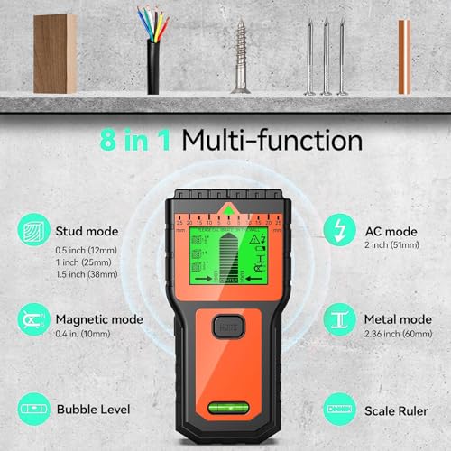 8 in 1 Stud Finder Wall Scanner, Electronic Stud Detector Finder with LCD Display & Audio Alarm, Stud Sensor Edge Center Finding for Wood AC Live Wire Metal Studs Detection Joist Pipe (Orange)