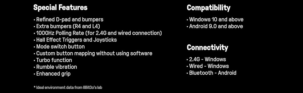 - Refined bumpers and D-pad. Light but tactile. Mode switch button. 2.4G and wired for Windows, Bluetooth for Android.