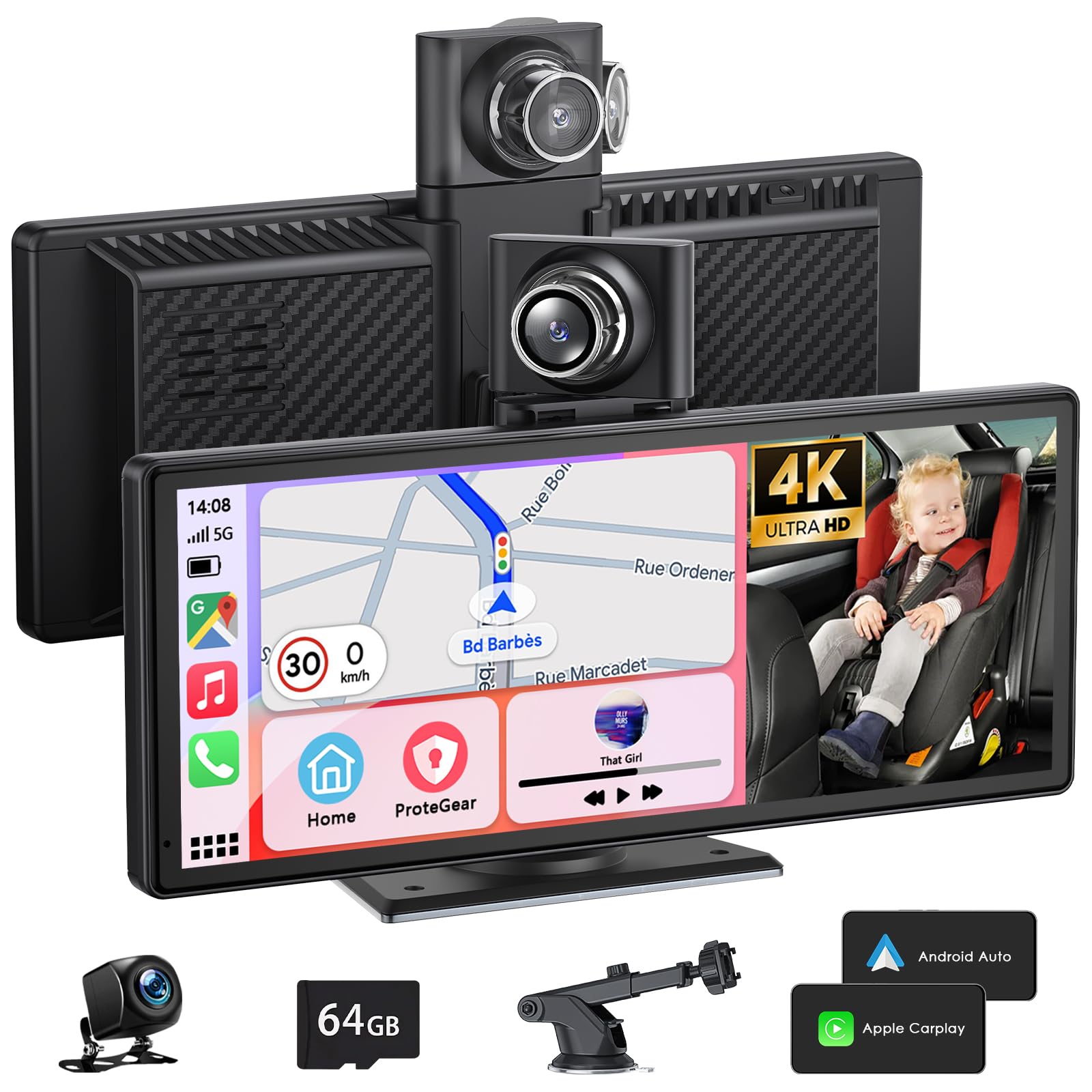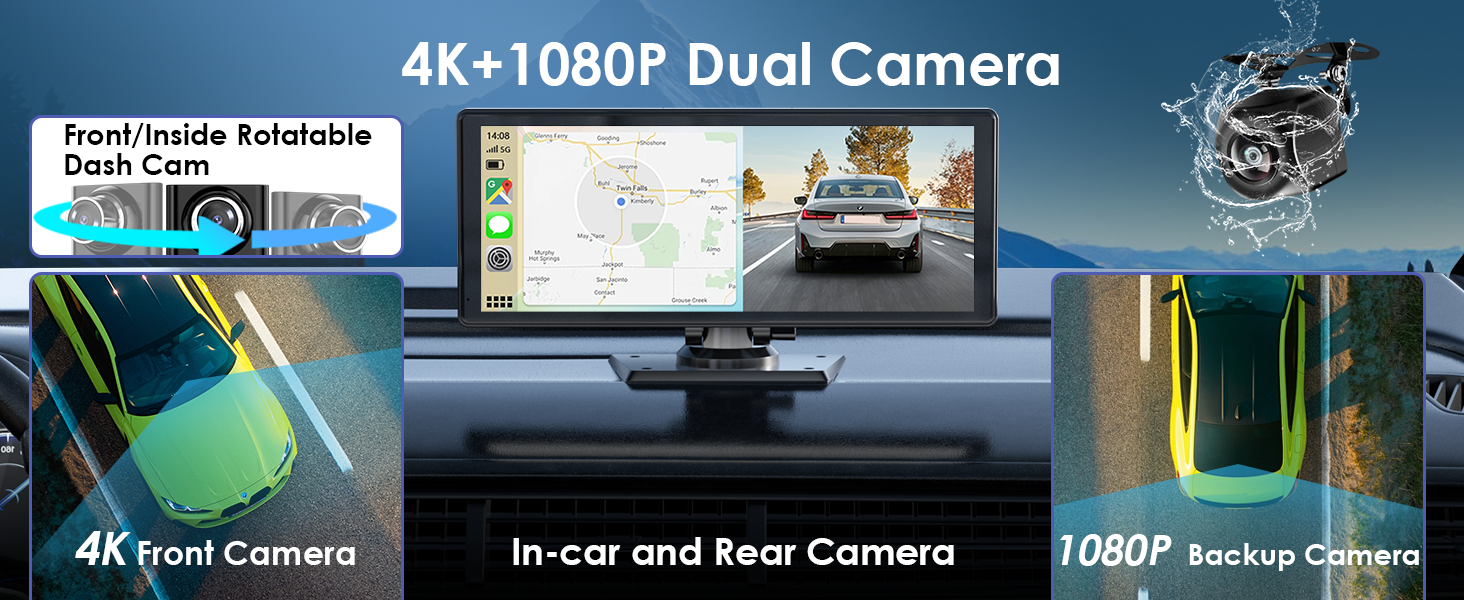 【Dual 4K/1080P Dashcams & Expandable Storage】Boost safety with a front 4K Ultra HD camera and 1080P HD backup camera for car, powerful night vision and IP65 waterproof, capturing crisp footage day or night. Pre-installed 64 GB TF card support Loop Recording.