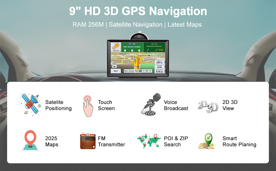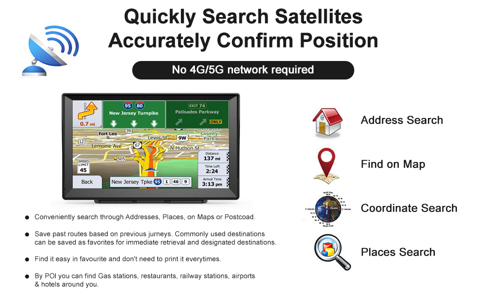 【Intelligent GPS Navigator】This truck sat nav features with many convenient searching methods like postcode, address, coordinate searching & POI. It also comes with a speed camera alert, street name broadcasting, lane guidance assist, real voice broadcast functions, and 2D and 3D mode navigation to make your driving experience more convenient.If you find that there is no signal in the car, you can check whether there is an MP3 or other device in the car that interferes with the signal, or whether there are any tall buildings around that block the signal.