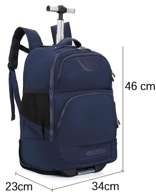 Transform your travel experience with this versatile rolling backpack that seamlessly combines functionality and comfort. The rucksack features multiple well-organised compartments, perfect for storing laptops, tablets, and travel essentials. Its innovative design includes both smooth-rolling wheels and padded shoulder straps, offering flexibility in how you carry your gear. The spacious interior boasts a stylish grey geometric pattern lining and numerous pockets for efficient organisation. Whether you’re navigating airport terminals, heading to business meetings, or embarking on outdoor adventures, this backpack adapts to your needs. The durable construction ensures reliability during hiking and camping trips, while the professional appearance makes it suitable for business travel. The ergonomic design includes adjustable straps, strategic padding and retractable telescopic handle for comfort during extended use. This rolling backpack is an ideal companion for those who need a reliable, versatile bag that can handle various travel scenarios with ease, available in attractive colours black, blue, brown, grey, green, purple and red. DIMENSIONS: 23 x 34 x 46 cm; 2.1 kg, 32 Litres