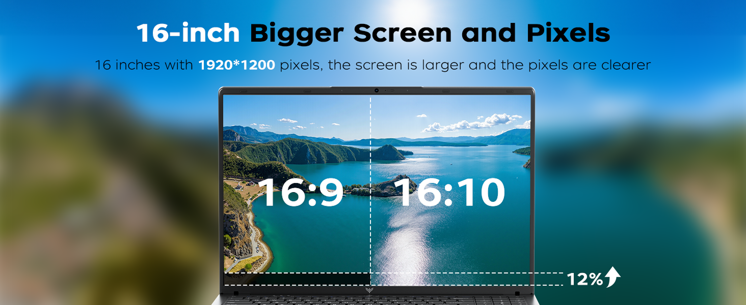 【16"Full HD BIG SCREEN】 The 16 inch laptop boasts a stunning 1920*1200 high-resolution screen that brings your content to life. The 93% screen-to-body ratio maximizes your viewing area while minimizing distracting bezels. With the laptop's 16:10 aspect ratio, you'll enjoy expanded vertical real estate, making web browsing and document work more efficient and visually pleasing.