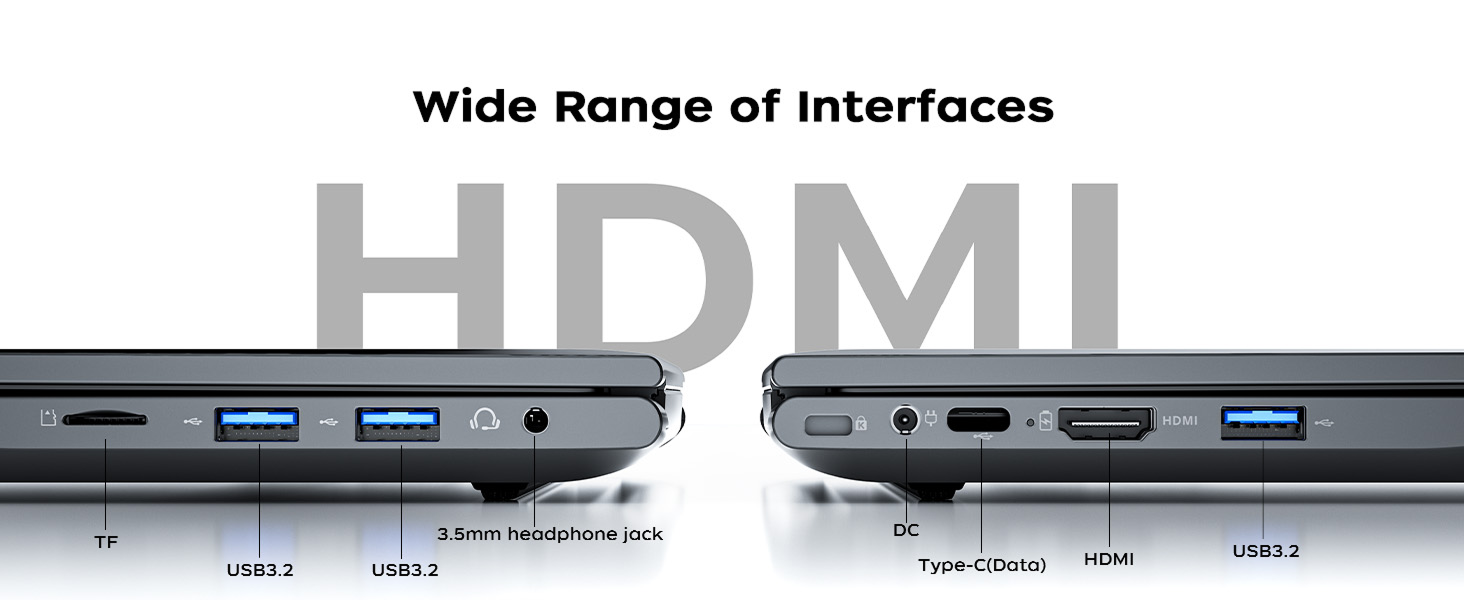 【RICH EXTERNAL PORTS】The Laptop PC has built-in 802.11ac WiFi and Bluetooth 5.0, dual stereo speakers and a HD webcam for quick access to your network and devices so you can enjoy the online world. This laptop has HDMI Type A X 1, USB3.2 X 3, Type_C(Data) ×1, 3.5mm Headphone jack X 1, 128GB TF Card Socket X 1, DC Jack X 1 to connect multiple devices, expand your workspace and transfer data swiftly to enhance your productivity.