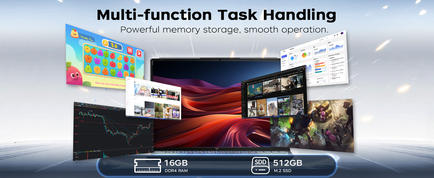【16GB RAM & 512GB ROM】The Notebook PC comes with DDR4 16GB memory for more space and 50% faster than DDR3-equipped machines, allowing it to efficiently handle multiple programs and tasks simultaneously. Built-in 512GB M.2 SSD, enough storage space to ensure smooth system while saving more personal files. Still need more space? The small laptop can support expansion of 128GB TF card, allowing you to store more digital treasures.