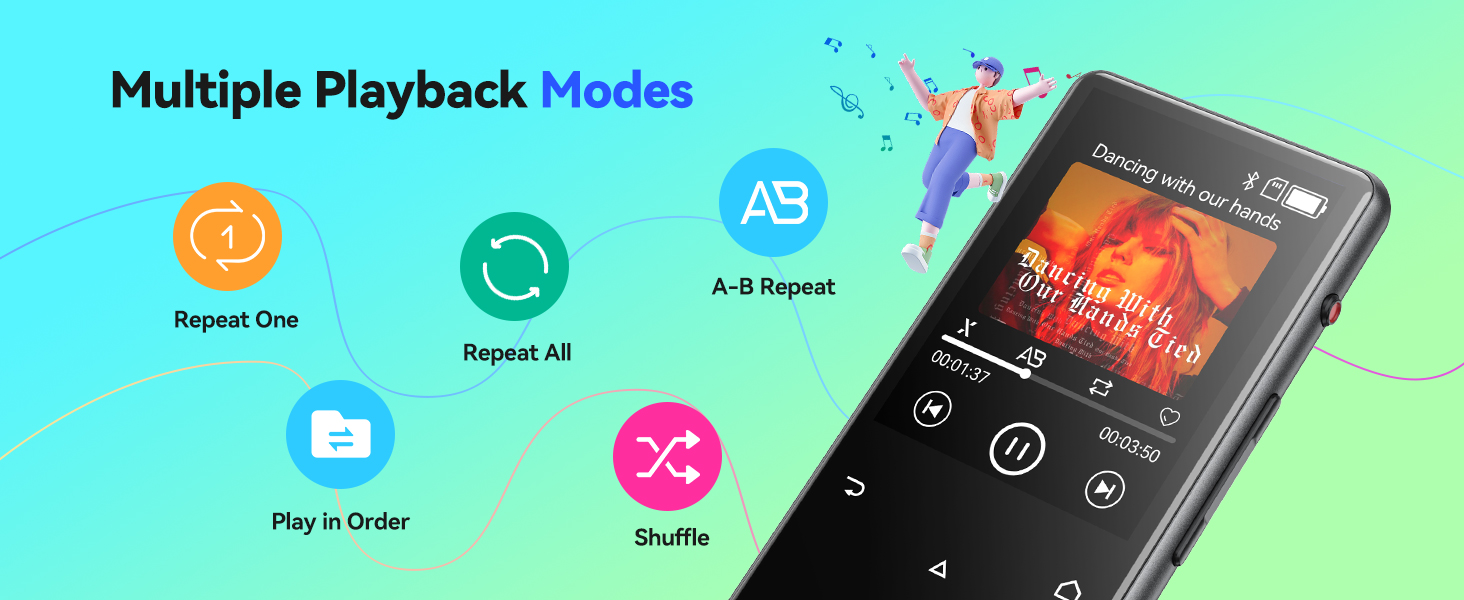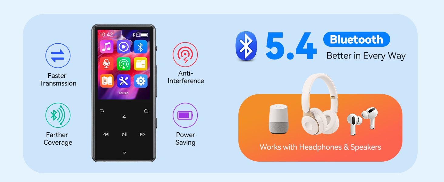 - 【Latest Bluetooth 5.4 & Automatic Reconnection】Featuring the latest Bluetooth 5.4 technology, this mp3 players offers a faster, more stable wireless connection with extended range and stronger anti-interference capabilities. You can pair the Bluetooth MP3 Player with wireless headphones or a Bluetooth speaker, automatically connects to the last Bluetooth device it was connected to, as soon as it is activated.