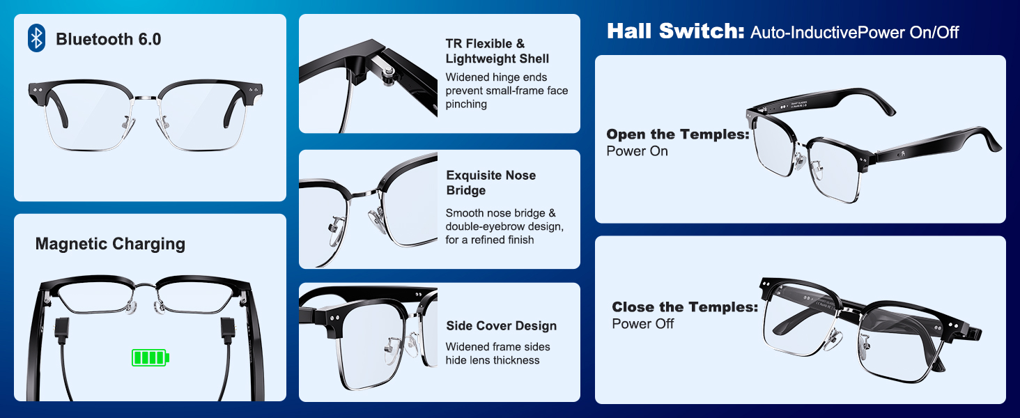 【Stylish and Lightweight Design】 Weighing only about 33 grams, gaming glasses comfortable to wear without burden. With a stylish appearance design, it is suitable for various occasions. The temple adopts an Wear induction and automatic matching technology, automatically powers on when worn, auto – reconnects, stops when removed, and shuts down 15 seconds later ,eliminating the need for cumbersome operations. The charging is designed with dual magnetic suction, which is convenient and quick.