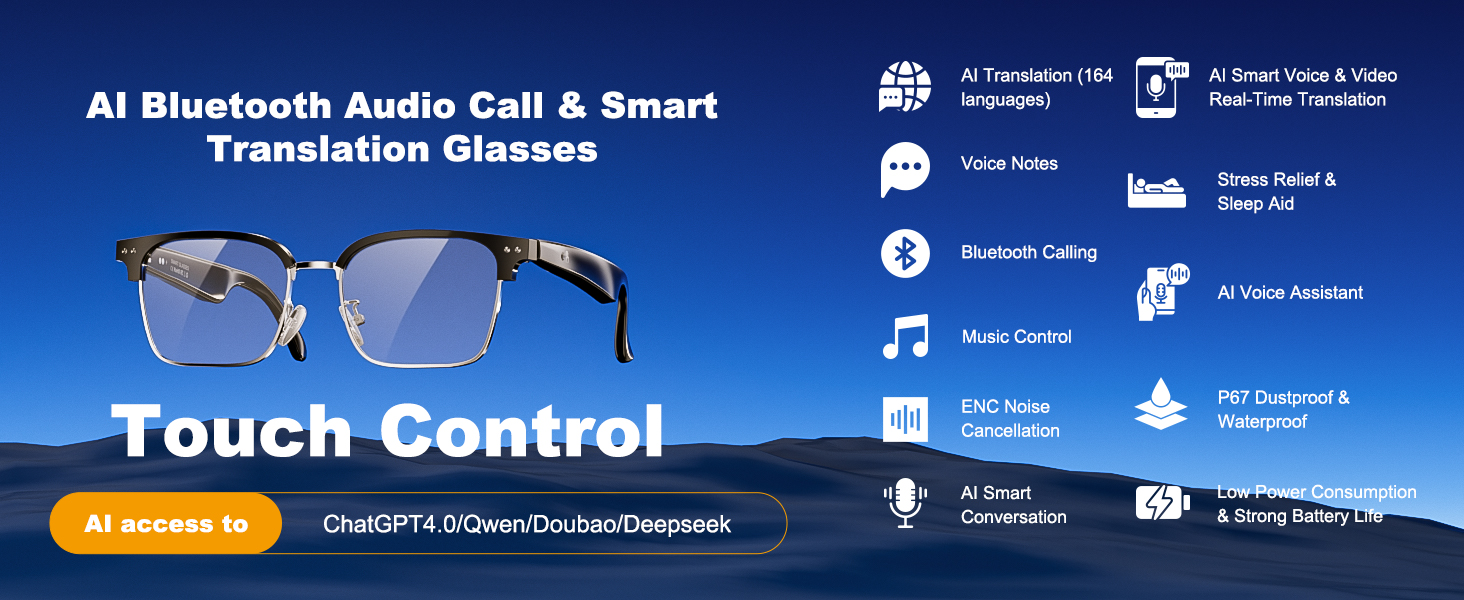 【Smart Translation Glasses for 164 Languages】:These Smart Bluetooth glasses, powered by ChatGPT, provide real-time translations across 164 languages (covering 99% of the world's languages). Featuring modes such as face-to-face conversations, video calls, and photo translations, they adapt to any situation, easily bridging language gaps.
