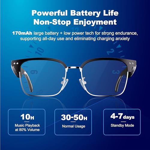 【All-Day Battery & Multi-scene application 】Our blue light blocking glasses have a built-in 175mA battery that can be fully charged in 1.5 hour and can support 10 hours of playback .Standby time lasts 4 to 7 days.suitable for various occasions, such as office, driving, outdoor sports, network meetings, etc. Smart Bluetooth glasses make your life more convenient and efficient.