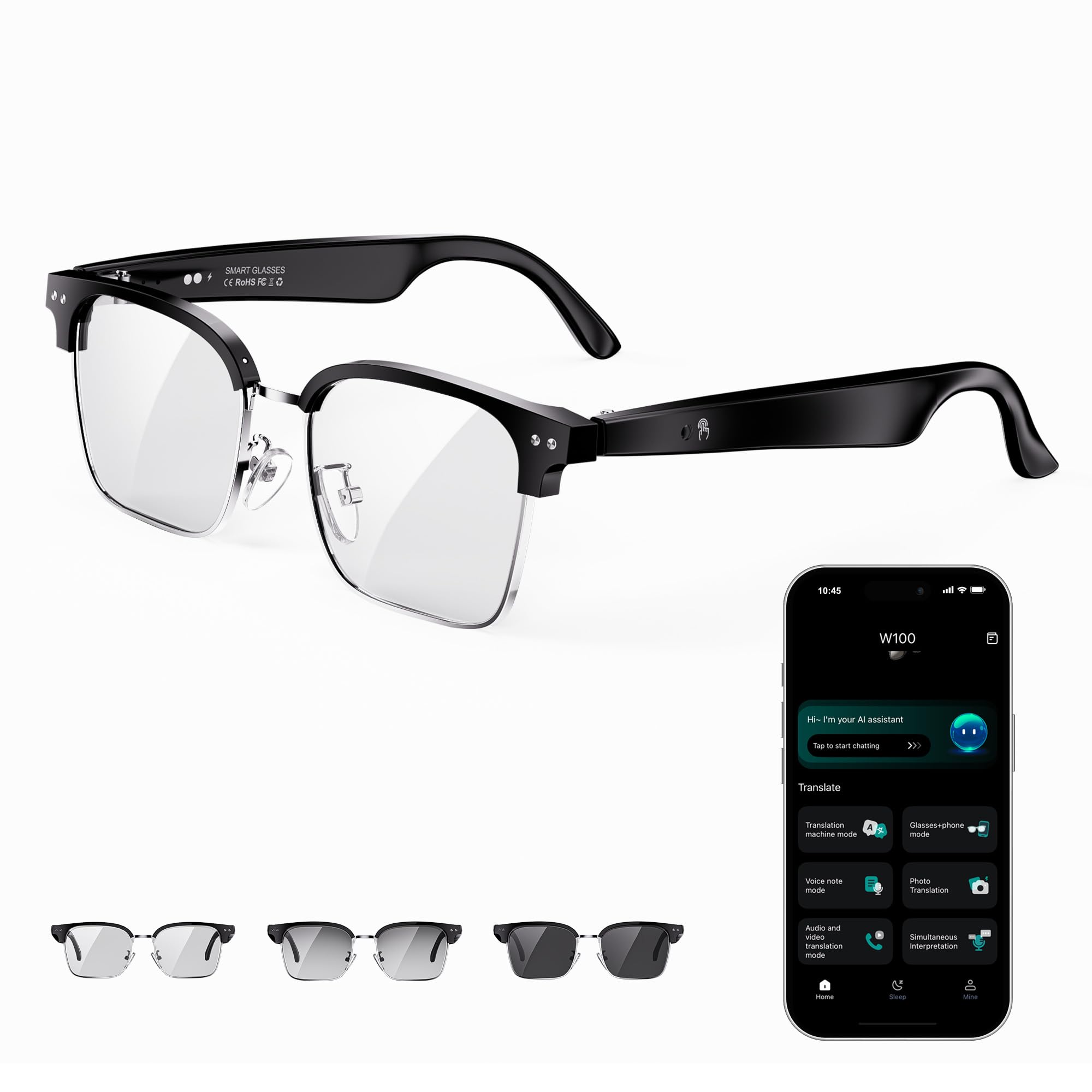 AI Smart Glasses for Men and Women with Chat GPT, Bluetooth Translation Glasses with 164 Languages and Color-Change Lens, Music Playback, Hands-Free Calls, UV & Blue Light Protectio