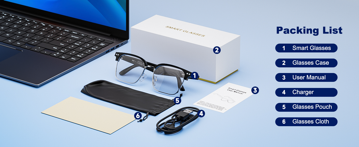 【What You Get】 Smart audio glasses*1,Charging cable*1,Glasses case *1,User manual*1,Glasses cloth*1.