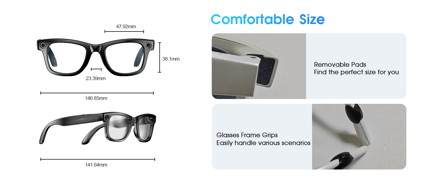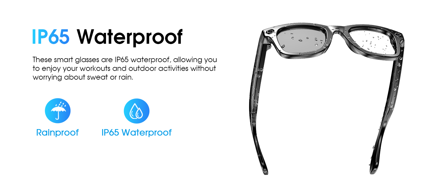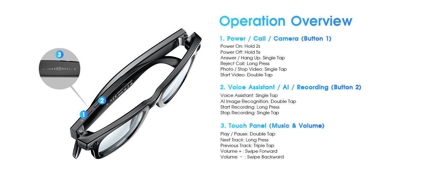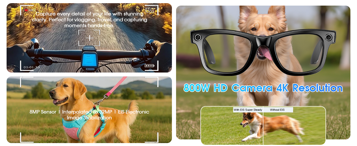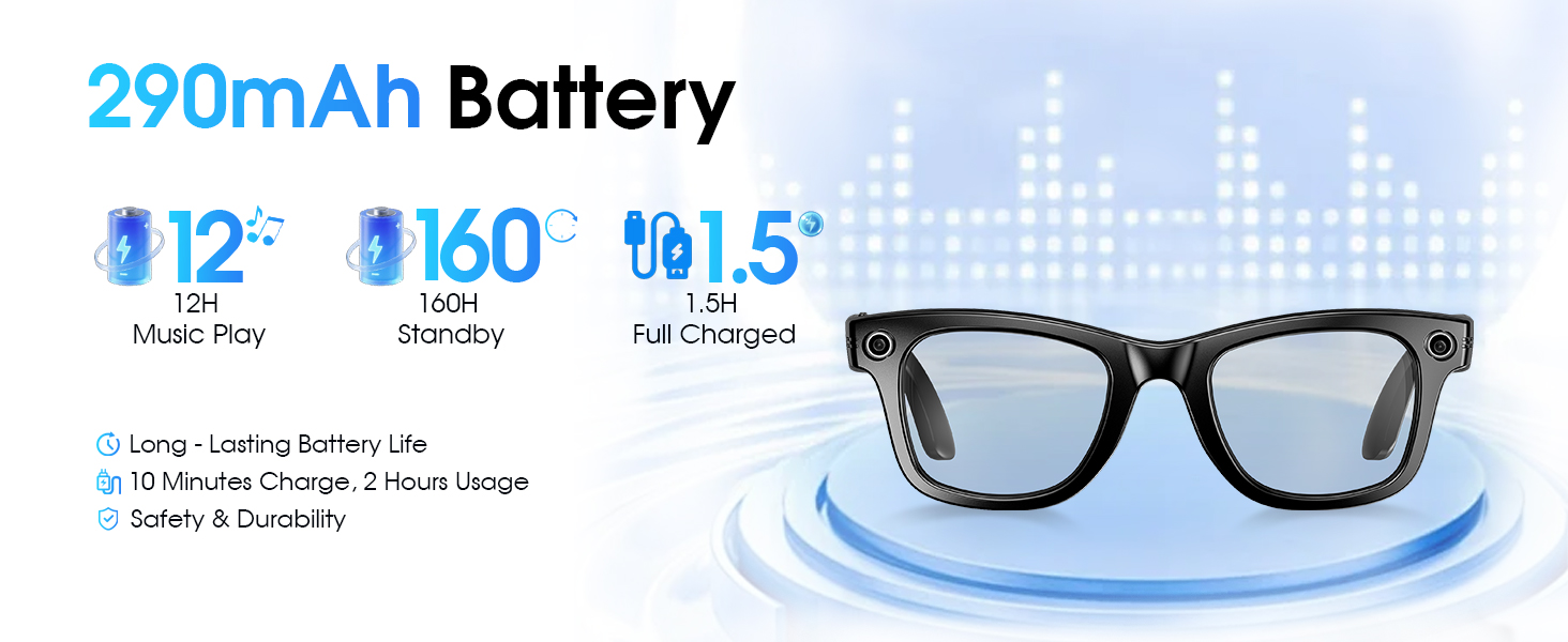 - [Long Battery Life & Smart Touch Control] Equipped with a 290mAh battery, these video recording glasses deliver 4 hours of music playback, 2 hours of call time, and support 60-minute fast charging for all-day outdoor use. The camera glasses can capture photos, record videos, and audio through side button controls. Featuring Bluetooth connectivity, these smart glasses with camera also enable volume adjustment via swipe gestures along the temple arms.