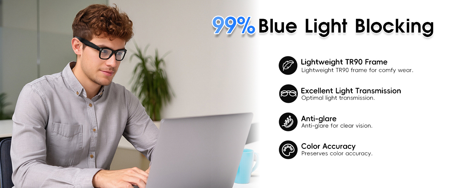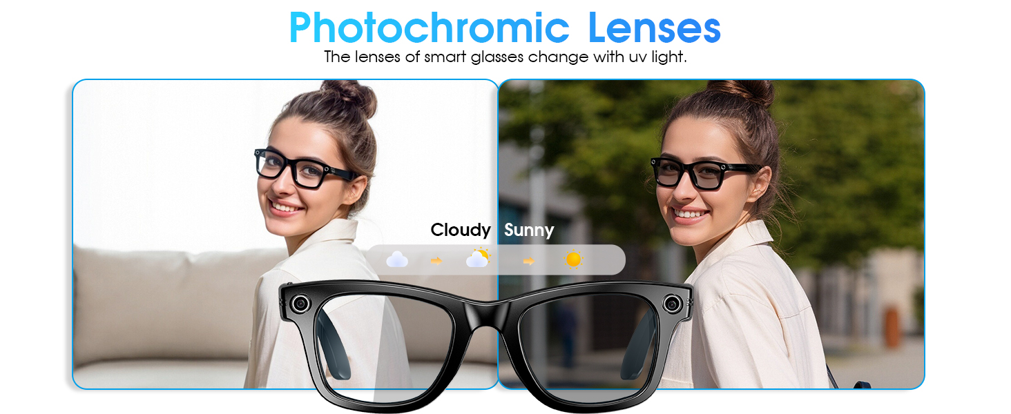 - [Enhanced Eye Protection] These multifunctional Bluetooth smart glasses offer more than just translation. Featuring self-tinting photochromic lenses that automatically adapt to light conditions, along with built-in blue light filtering and UV400 protection, they ensure optimal visual comfort during digital device use and outdoor activities. Enjoy always-optimized vision and comfort.