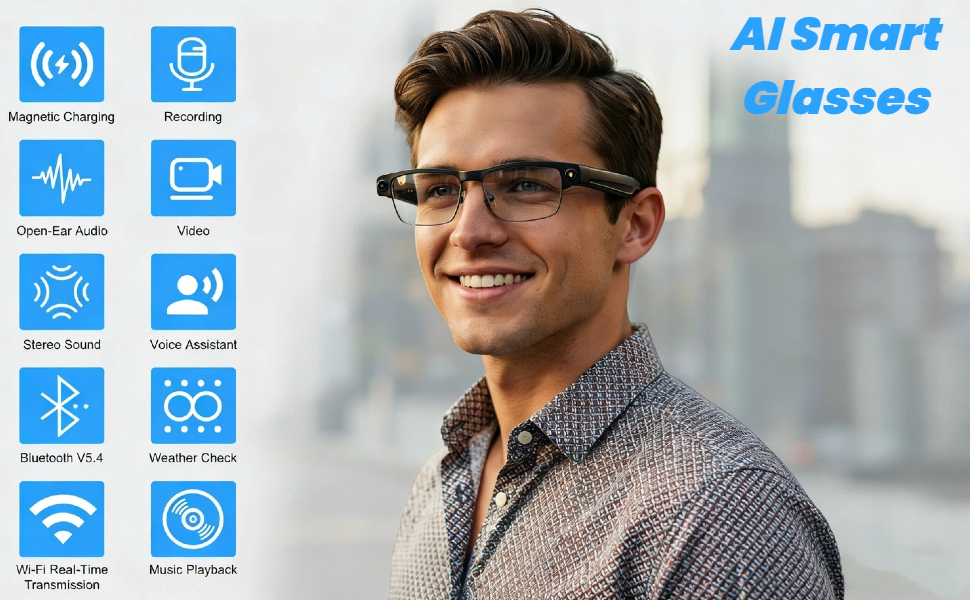 - 【270mAh Battery Long-Lasting】AI smart bluetooth glasses is built with a 270mAh rechargeable battery, these glasses support extended use for music, calls, recording, and translation. The convenient magnetic charging ensures quick and secure power-ups, so you can stay powered throughout the day without frequent interruption