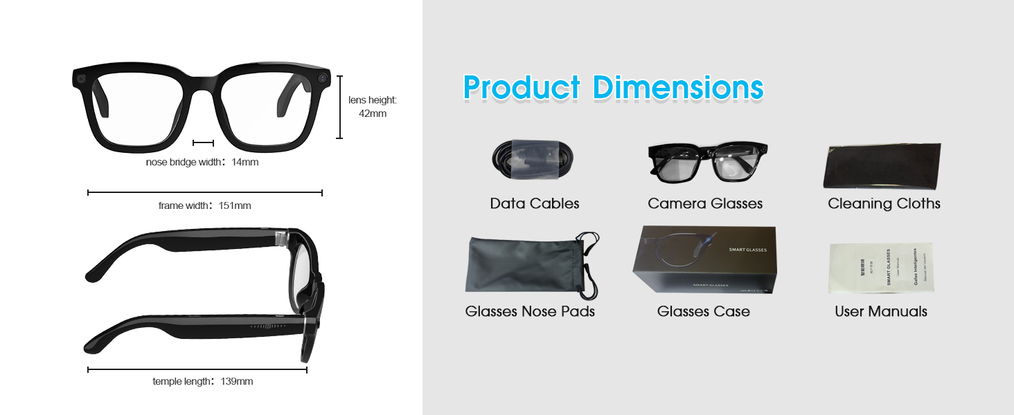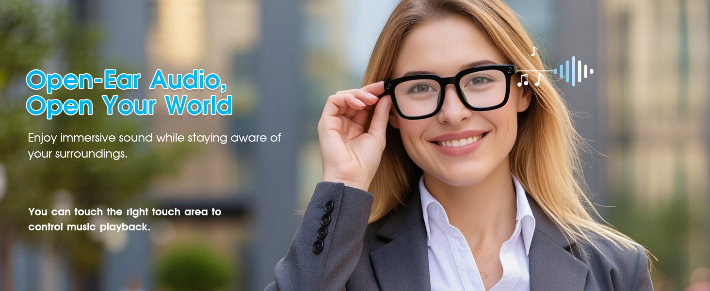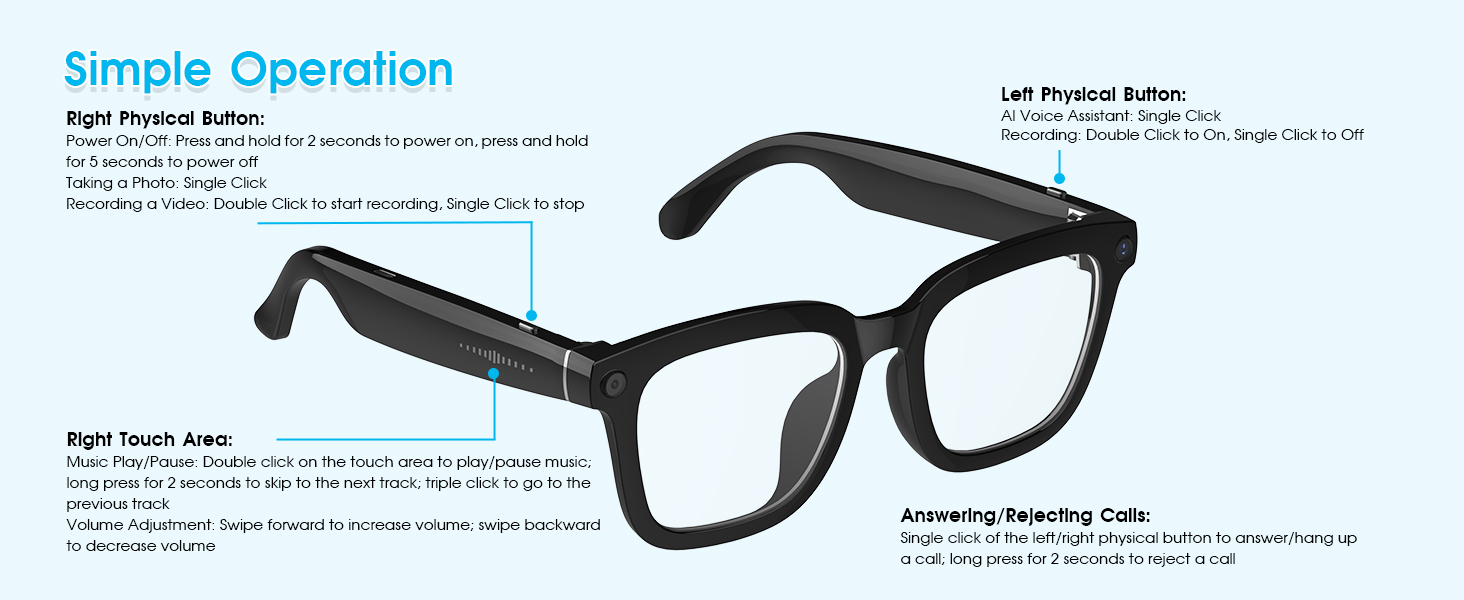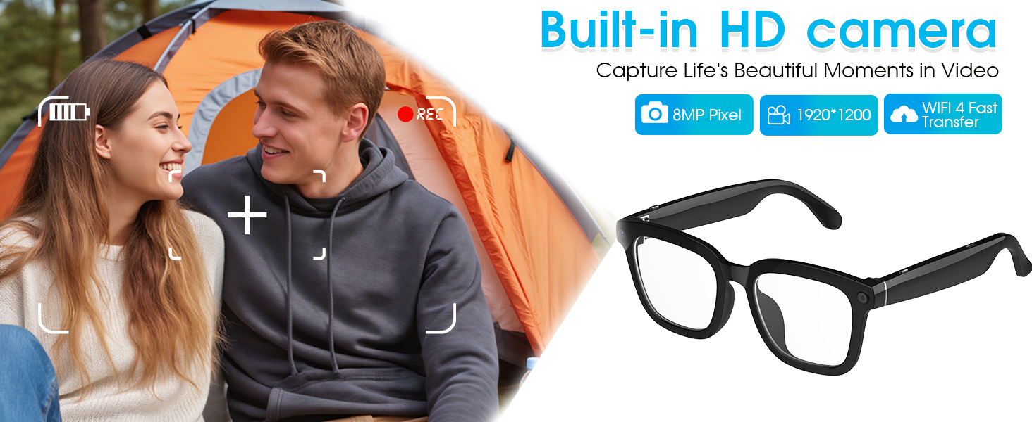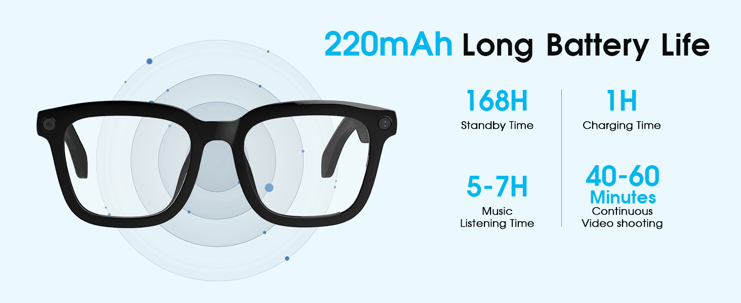 - [Long Battery Life & Smart Touch Control] Equipped with a 290mAh battery, these video recording glasses deliver 4 hours of music playback, 2 hours of call time, and support 60-minute fast charging for all-day outdoor use. The camera glasses can capture photos, record videos, and audio through side button controls. Featuring Bluetooth connectivity, these smart glasses with camera also enable volume adjustment via swipe gestures along the temple arms.
