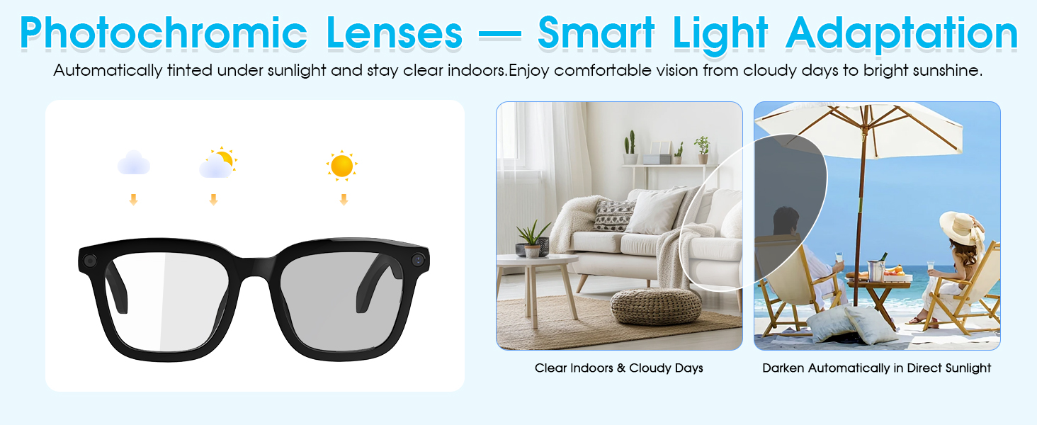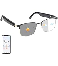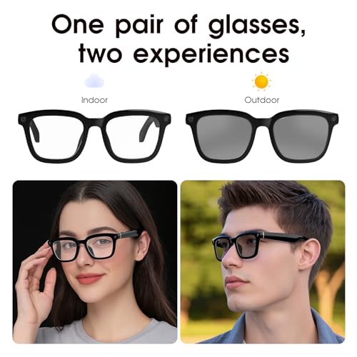 - [Enhanced Eye Protection] These multifunctional Bluetooth smart glasses offer more than just translation. Featuring self-tinting photochromic lenses that automatically adapt to light conditions, along with built-in blue light filtering and UV400 protection, they ensure optimal visual comfort during digital device use and outdoor activities. Enjoy always-optimized vision and comfort.