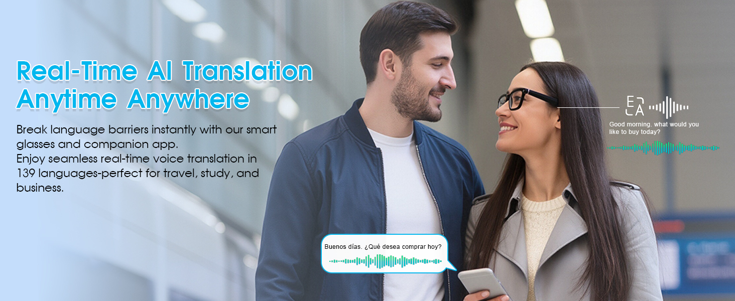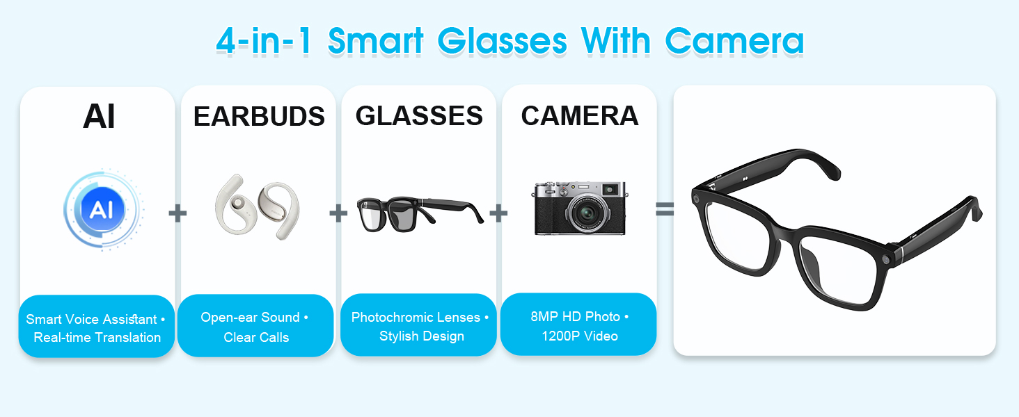 - [Real-time AI Translation & Recording Glasses] Overcome language barriers instantly! These smart glasses with a built-in camera provide advanced translation across 26 languages. Simply preset your source and target languages for accurate real-time audio translation and playback. Ideal for travel, business meetings, or educational purposes, these camera glasses also support independent audio and video recording. The integrated microphone clearly captures conversations for seamless translation or standalone recording tasks.