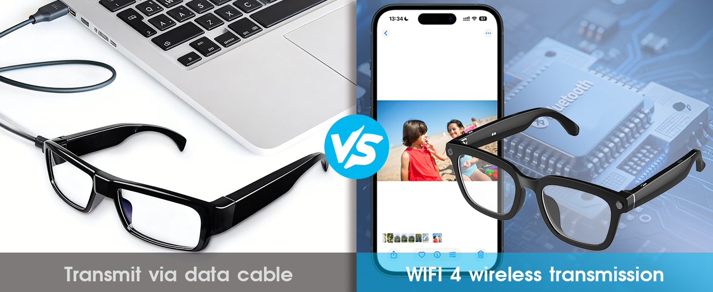 - [16Gb Large Storage & Easy Offline Transfer] These recording glasses come with 16GB internal storage for photos, videos, and audio. Transfer files effortlessly WITHOUT cellular data or Wi-Fi! Use the dedicated HeyCyan App with WiFi 4 for direct cloud import. The glasses automatically delete transferred files to free up storage space.