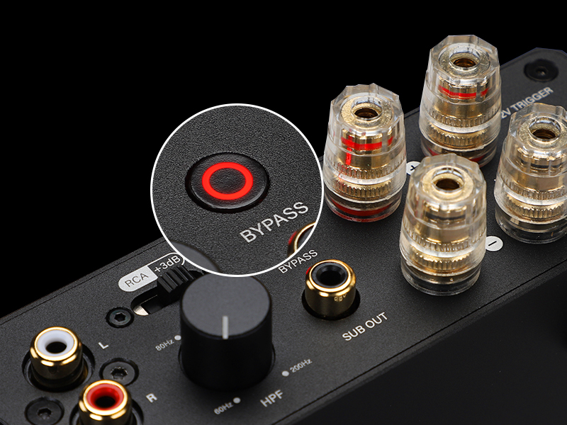 In BYPASS mode, the amplifier volume is maximized. Before switching to this mode, reduce the volume at the audio source to prevent hearing and speaker damage. This mode has memory function; long press for three seconds to exit.