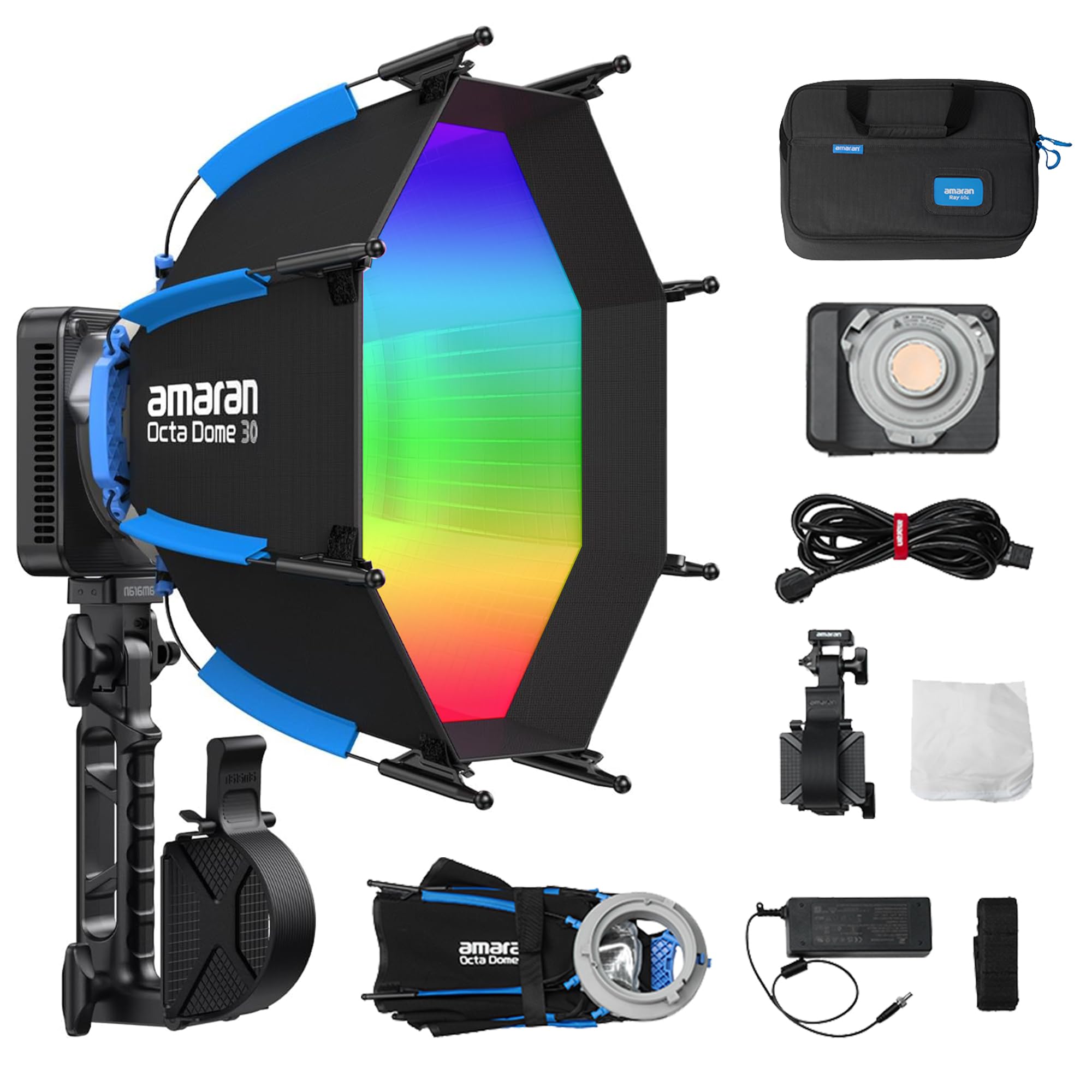 It comes with amaran Octa Dome 30 softbox and accessories, Ace Lock to Baby Pin Adapter, Power Adapter, and Cable, all in a dedicated bag