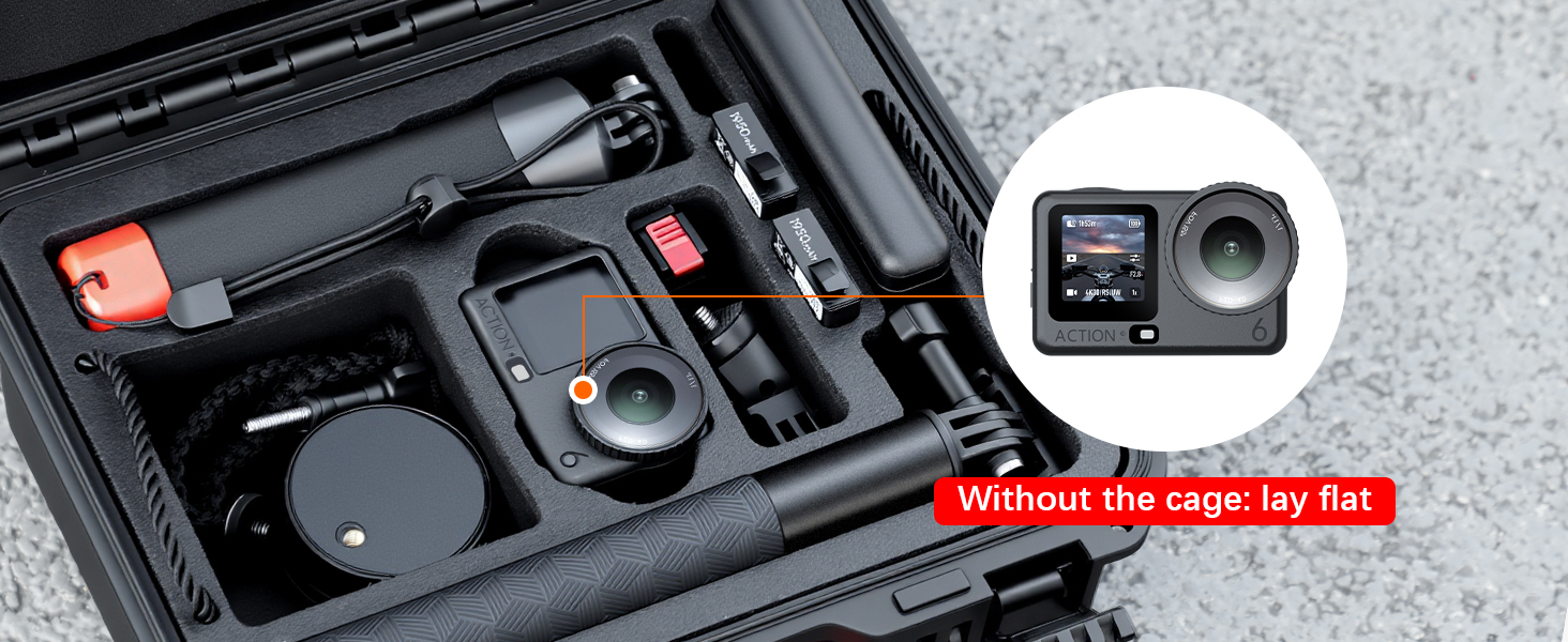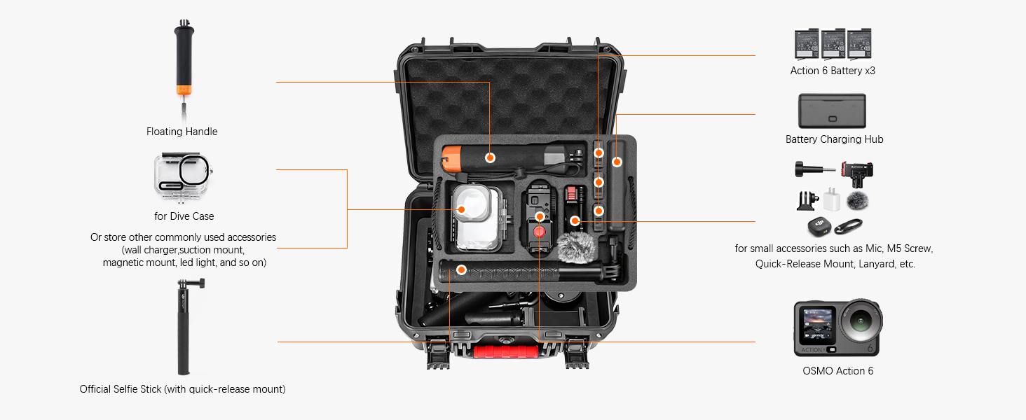 【Precise Carving】1:1 customized for DJI OSMO Action 6 – The top layer offers a tailored storage system for: Action6 camera, Dive Case, Charging hub (Multifunctional Battery Case), 3 batteries, Floating handle, Selfie Stick (Extension Rod Kit).
