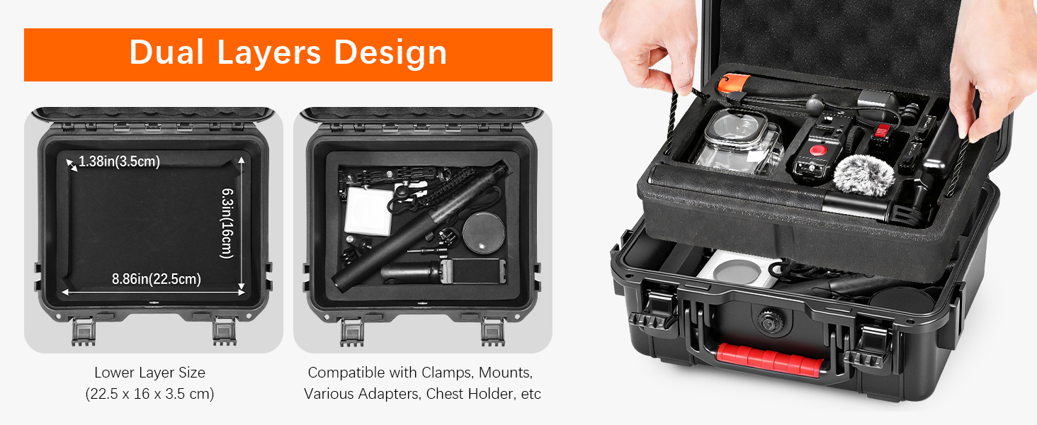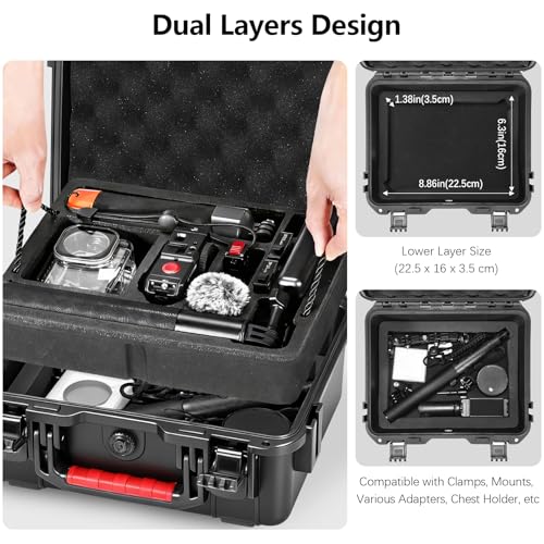 【Wide Compatibility】The waterproof double-layer hard case is designed for DJI OSMO Action 6 camera along with its various accessories. The exterior is made of rugged non-deformable PP material, while the interior features a precisely customized EVA lining for superior softness. Includes a detachable shoulder strap.
