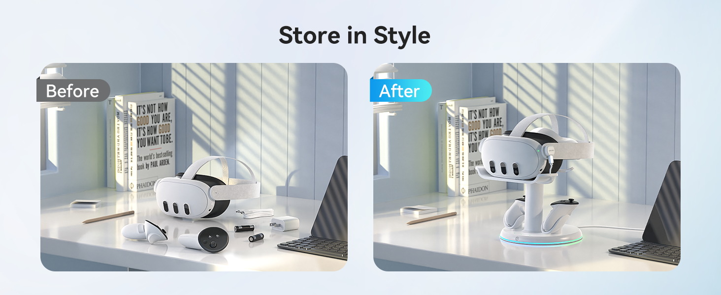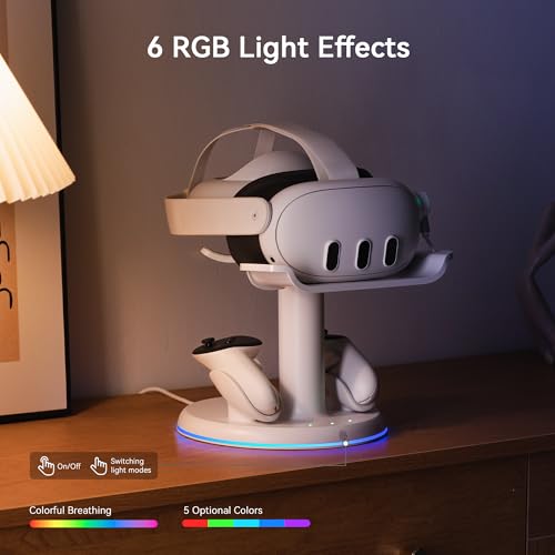 - Universal Compatibility – This RGB charging dock is specifically designed for the Quest 3 and Quest 3S, and works seamlessly with your customized setup—accommodating most facial interfaces and head straps, etc