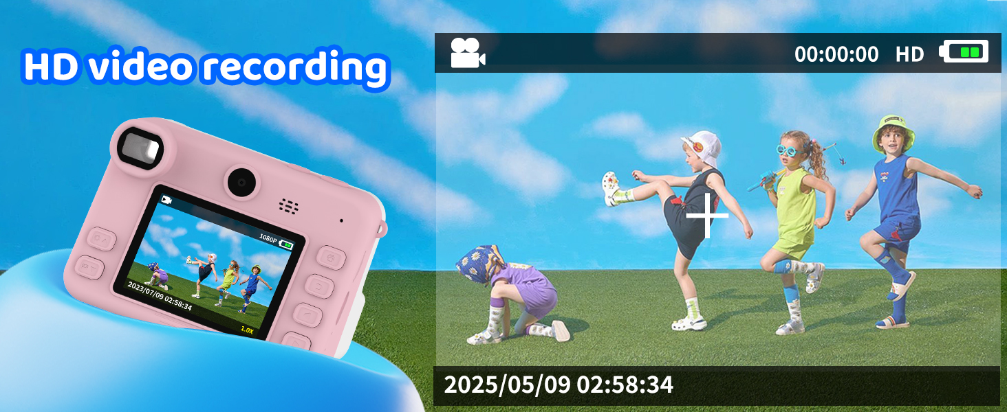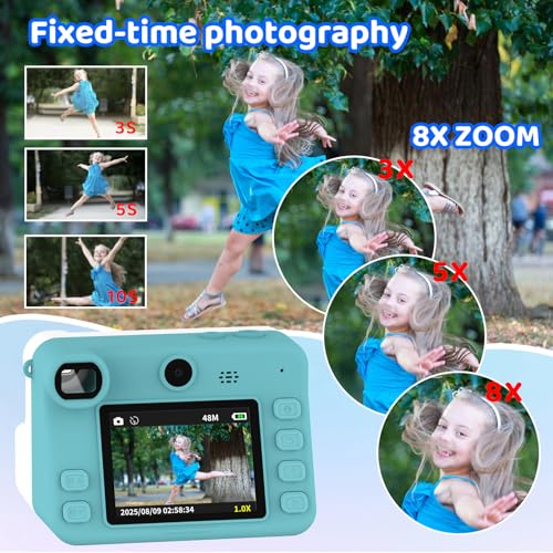 - 1080P HD Video & 8X Zoom – Capture life in detail with 1080P video recording, clear photo shooting, and 8X digital zoom. Perfect for close-ups, landscapes, and everyday adventures. The camera also supports time-lapse shooting, encouraging kids to explore photography in new ways.