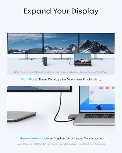 Flexible Display Options with Main Dock and Removable Hub: Set up a triple-screen workstation with the dock or connect one display through the hub when working away from your desk. (Note: On macOS, all external monitors mirror the same content. Only the HDMI or DisplayPort supports video output. The USB-C does not support video output.)