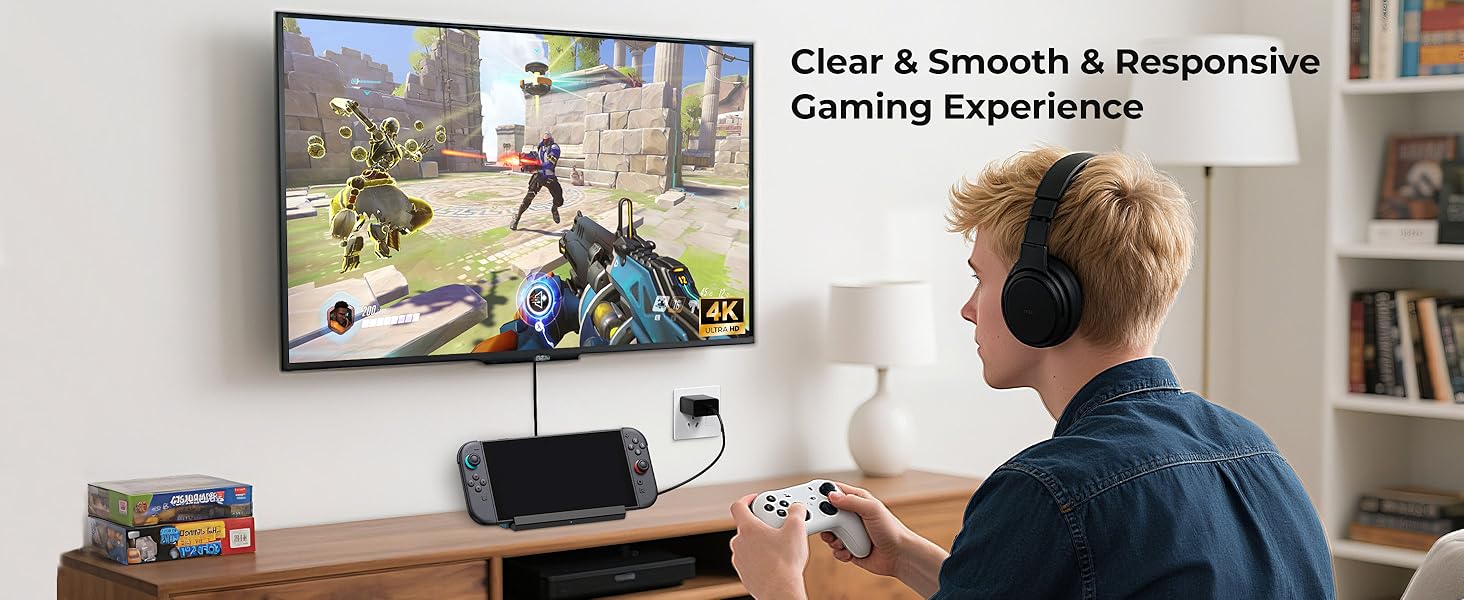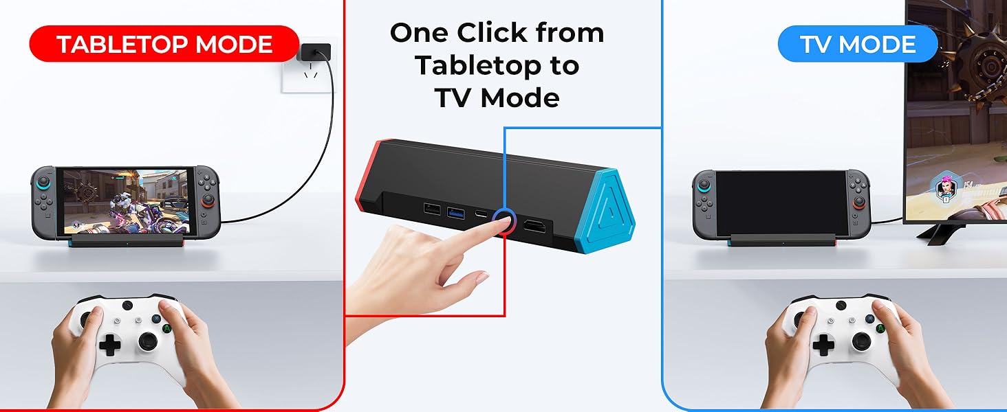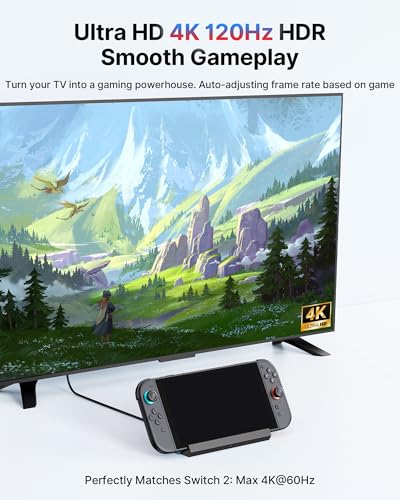 - One-Click Switch 2 Modes & 4K@120Hz Output: Press the button, you can switch Tabletop Mode or TV Mode. The docking station also supports ultra high definition video output in 4k120Hz/8k30Hz modes [Switch 2 only supports 4K@60Hz ], enjoy the amazing 4K gaming experience to the fullest