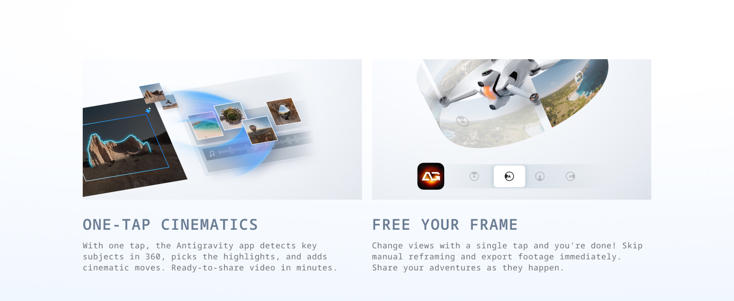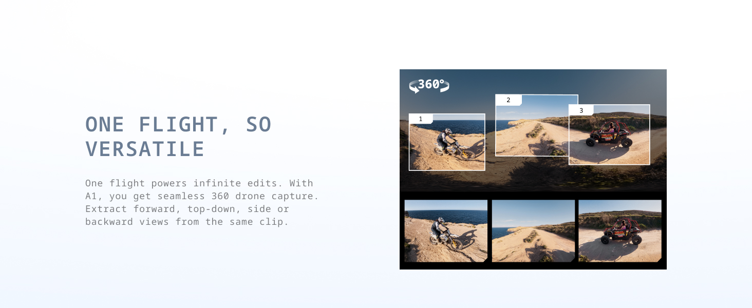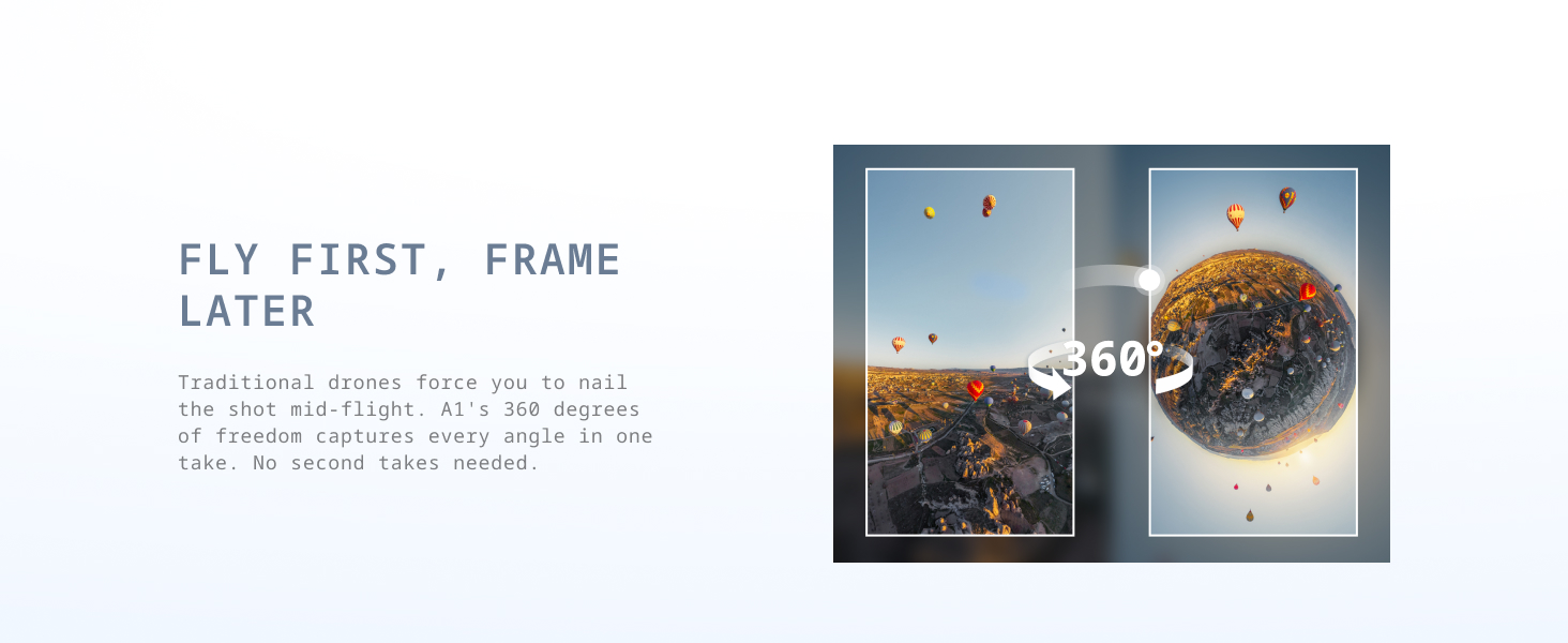 - Fly First, Frame Later – Camera drones and FPV drones force you to nail the shot mid-flight. A1's 360 degree capture gets all angles in one take. Missed the shot? Rewind and reframe the footage. Easy!