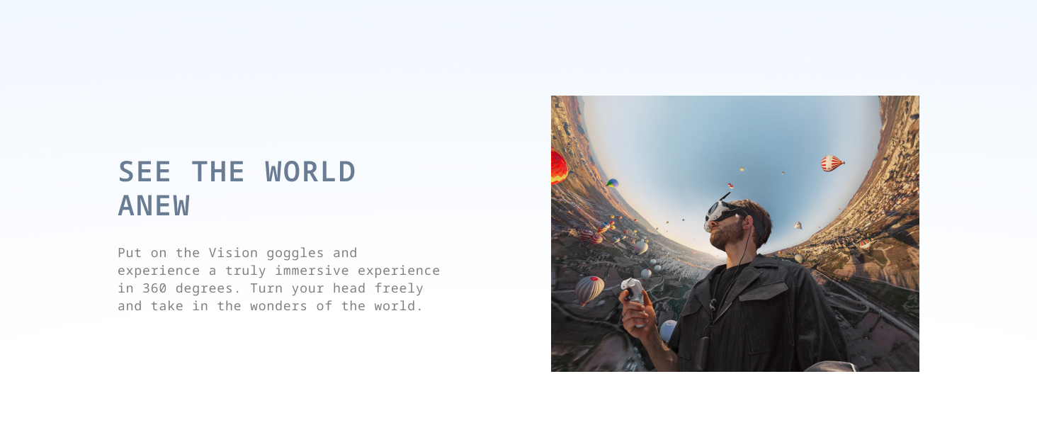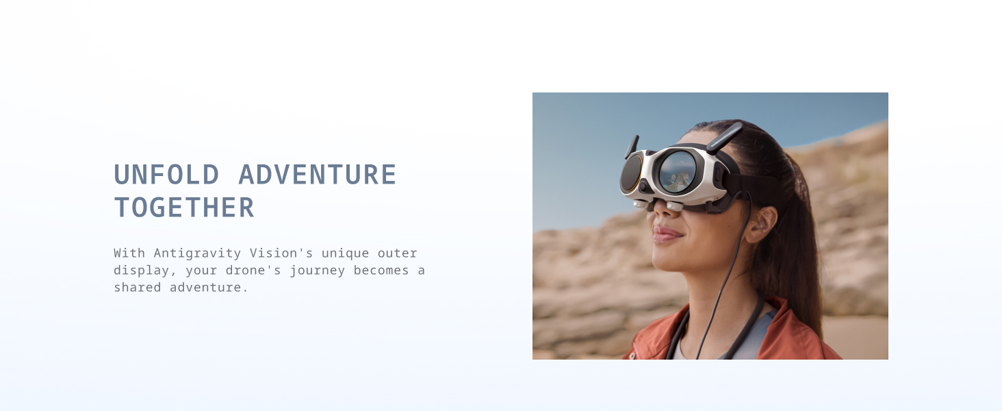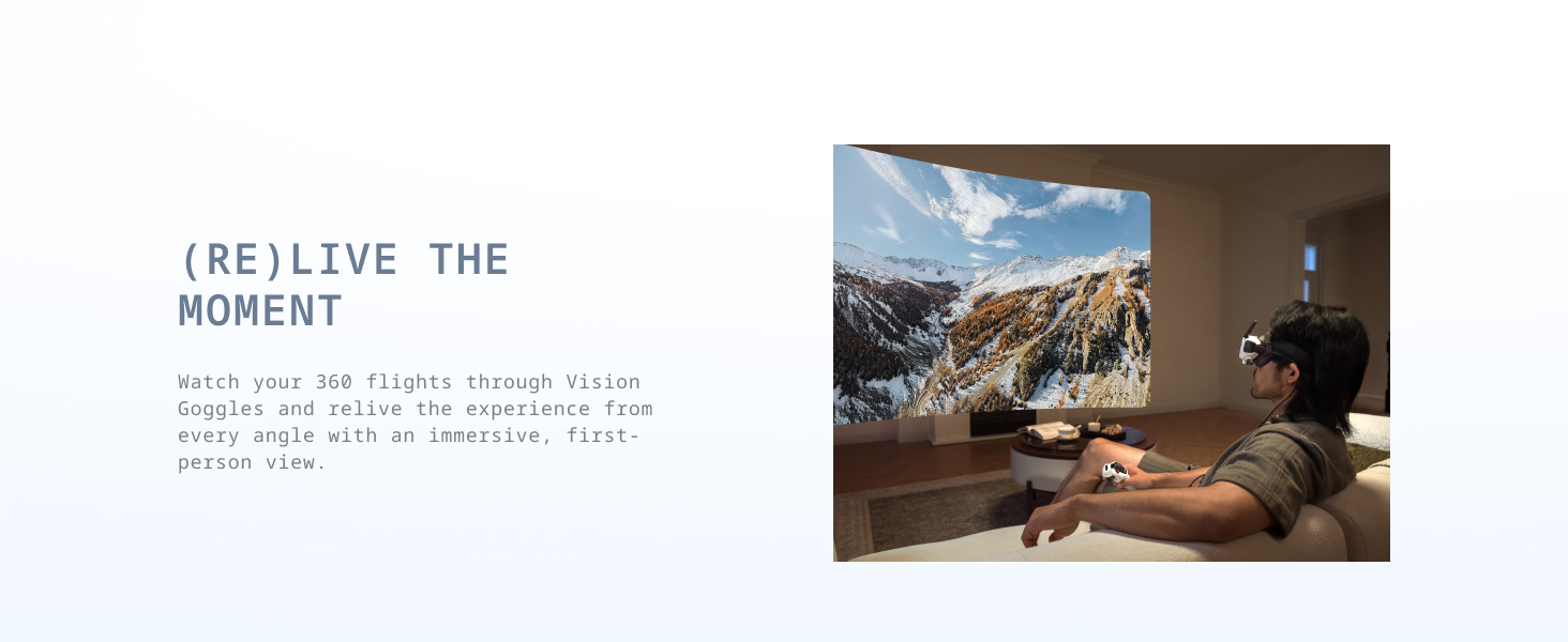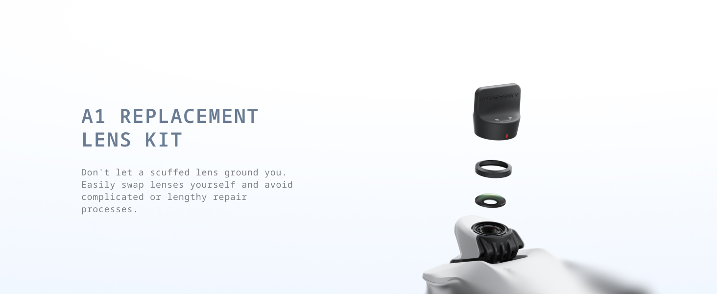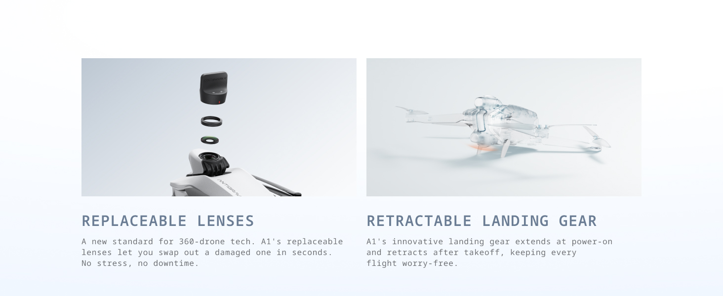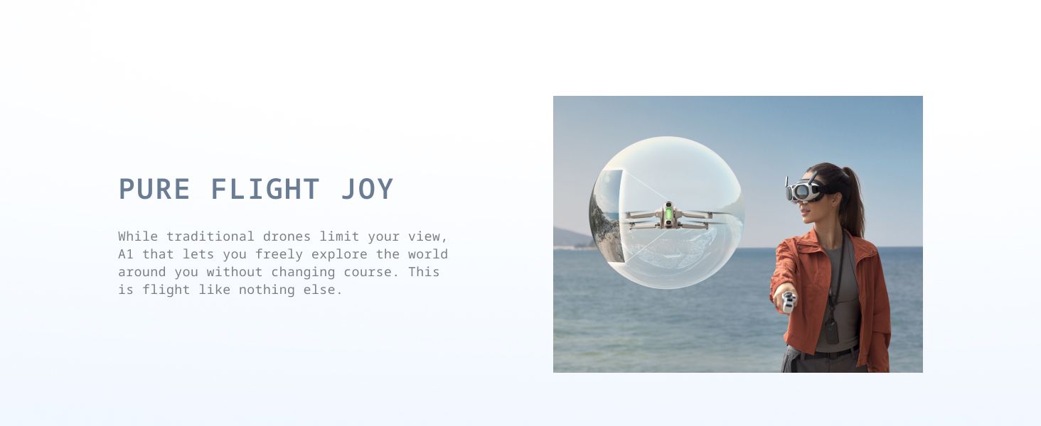 - 360 Immersive Flight – Put on the Vision goggles and step into true 360 immersion. Unlike traditional drones that lock your view to the flight path, A1 lets you freely look around. Powered by pancake optics and dual 1-inch micro-OLED displays, our goggles deliver uncompromised immersion.