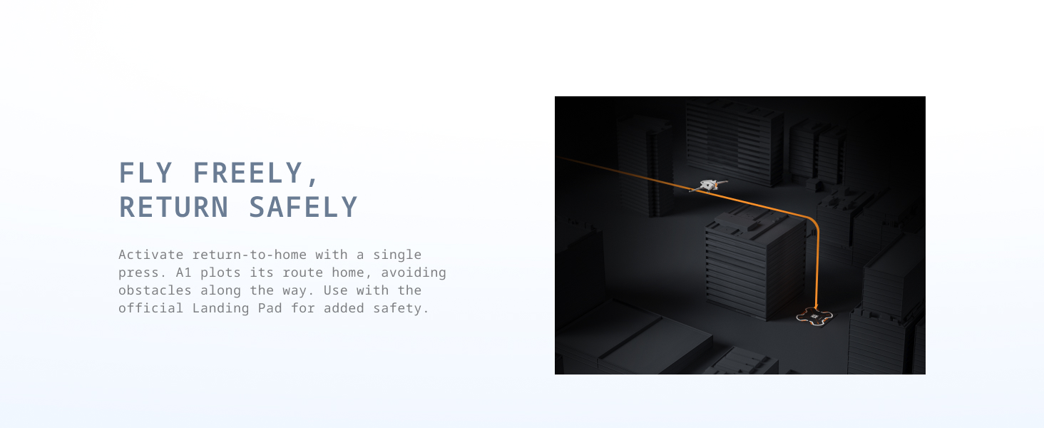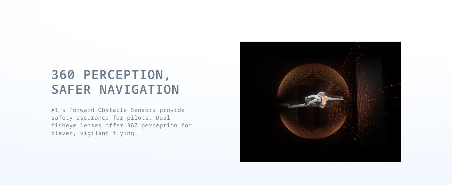 - Smart Obstacle Avoidance & Navigation Assist – A1's Forward Obstacle Sensors provide safety assurance for pilots. Dual fisheye lenses offer 360 perception, safeguarding smooth flight. Clean, clever, always vigilant.
