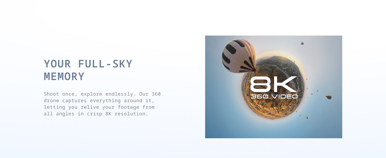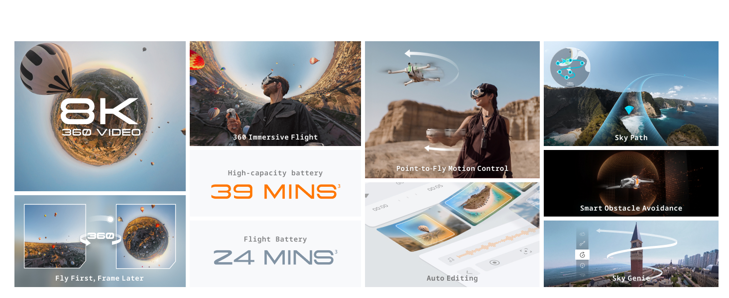 Merchant video- 8K 360 Video – Shoot once, explore endlessly. The world's first 360 drone captures everything around it, letting you relive your footage from all angles in crisp 8K resolution.